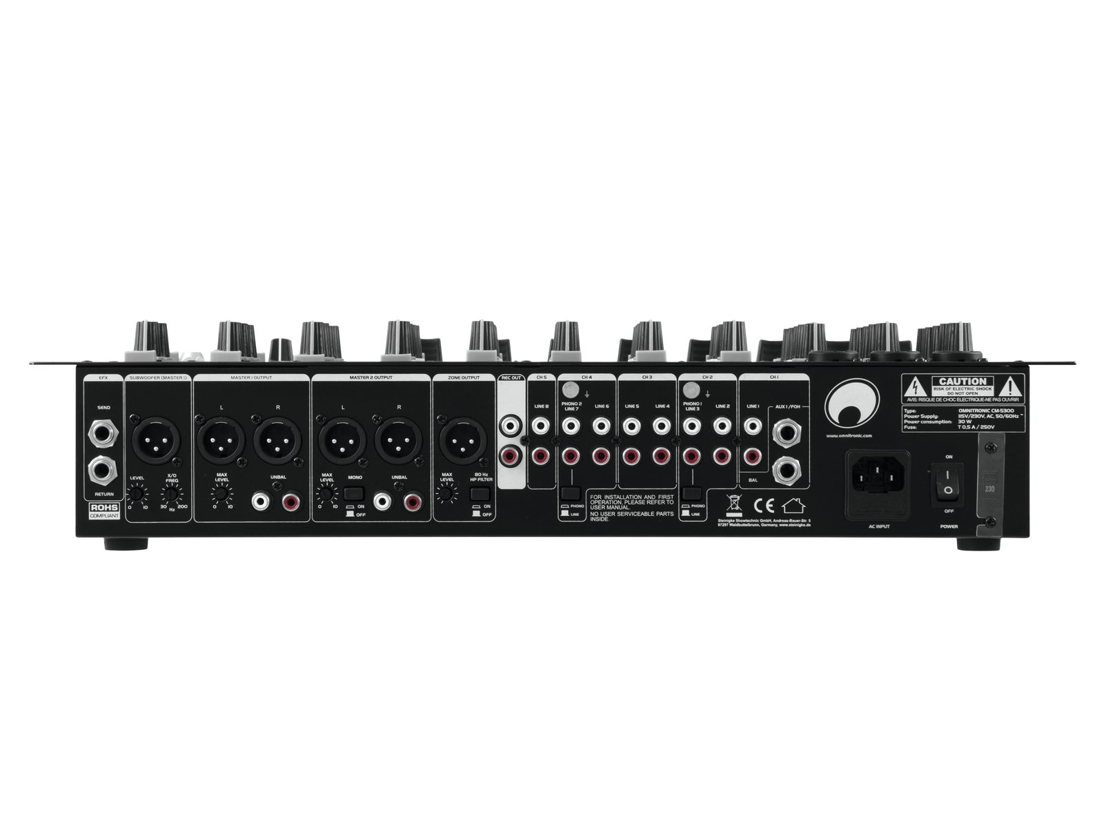 The CM-5300 is a high-grade stereo mixer with an extensive feature set for clubs and numerous mobile PA applications. The 3 microphone channels have a one-knob compressor, adjustable talkover function and a 3-band EQ. the 5 stereo channels come with gain controls, individual VU meters, 3-band kill EQs, 100mm dual-rail faders and assignable crossfader. Channel 1 can be used for FOH signals, channel 6 features a 3.5mm AUX input. The stereo and mono output sections have their own level meters, trimmers for adjusting the maximum output level and electronically balanced XLR connectors. In addition, a subwoofer output with built-in active crossover is provided. The mixer can be used as a table-top unit or installed in a rack.