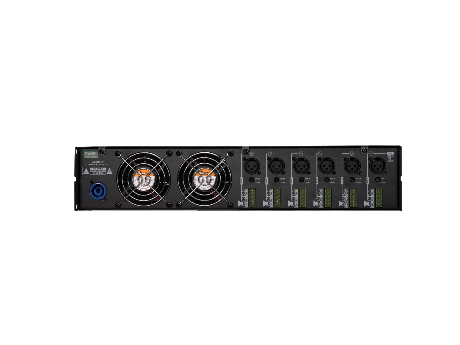 Class D multi-channel PA amplifier with SMPS, 6 x 500 W RMS (4 ohms), 6 x 250 W RMS (8 ohms)