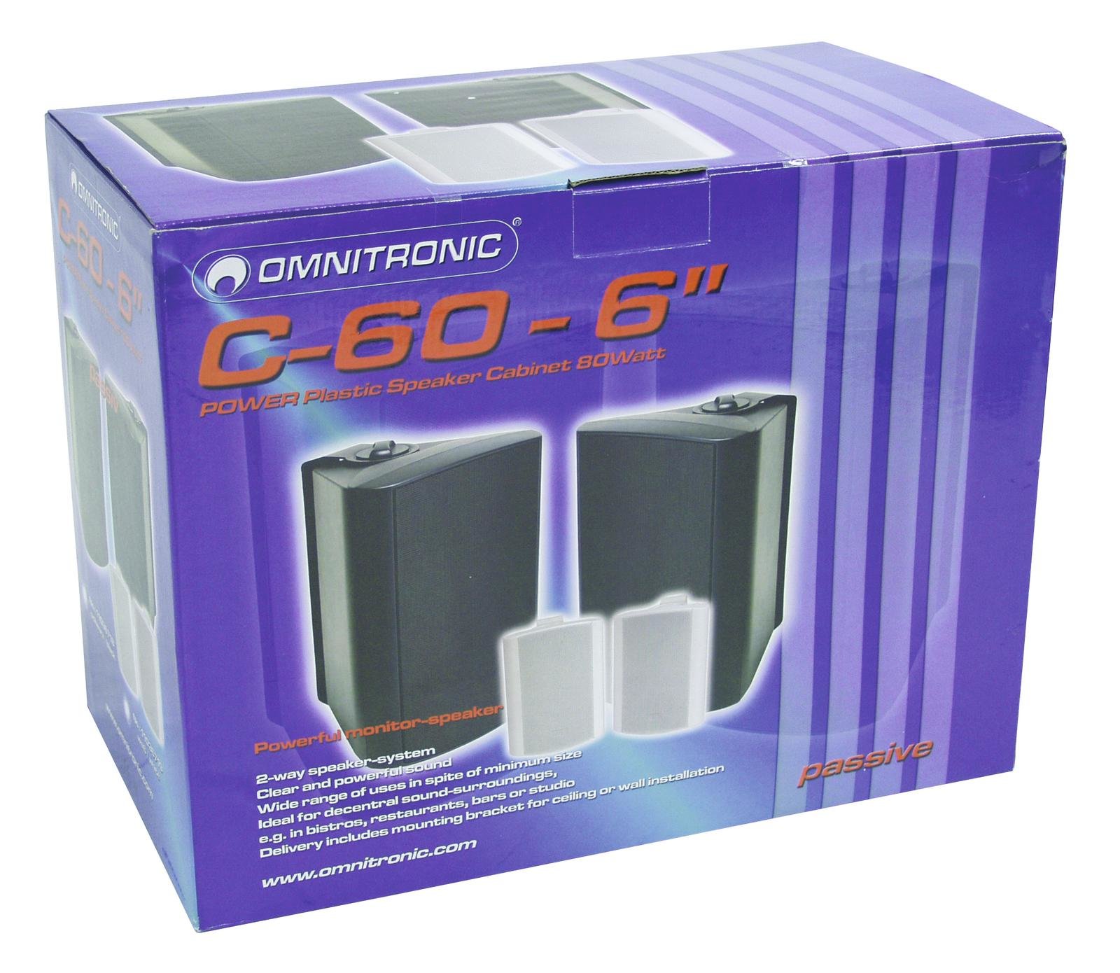Passive 2-way loudspeaker pair with mountingThe C-60 speakers in black are designed for permanent installation in your restaurant, bar, discotheque or shop, as well as in conference areas. The 2-way bass-reflex system is equipped with a 16.5 cm woofer and a 2.5 cm dome tweeter and provides powerful bass and clear treble. The trapezoidal design makes corner mounting easy, but you can also mount the speakers on the ceiling using the swivel mounting bracket.