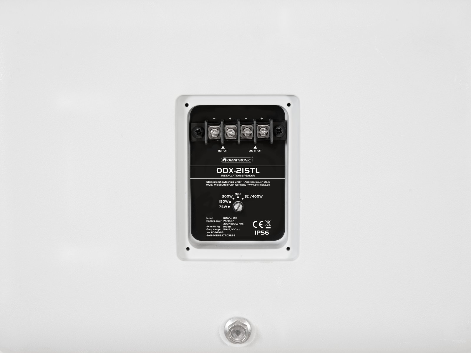 Home OUTDOOR PUBLIC ADDRESS SPEAKERS OMNITRONIC ODX-215TL Installation Speaker 100V white OMNITRONIC ODX-215TL Installation Speaker 100V white SKU: 11036969 1.025,52 € Desconto de %. IVA incluído. Comprar Contactar Adicionar à wishlist Weather-proof 15" wall speaker with mount, 400 W RMS2-way coaxial system with 38 cm woofer (15") and 3.6 cm tweeter (1.4")Durable plastic cabinet with metal grillePower selector switch with 8 ohms operating positionScrew terminals for parallel connectionWith Mounting bracketSuitable for outdoor use IP56Package contents1 x top, 1 x mounting bracket, 1 x user manual, 6 x screw, 1 x safety eyelet, 1 x lid, 8 x washer, 1 x screwingIP classification:IP56Power:Program: 800WRated: 400W RMSFrequency range:50 - 18000 HzSensitivity:103 dB (1W/1m)Max. SPL:129 dBDispersion angle:60° x 25°Impedance:8 ohms; Public address systems 100VAttachment system:Mounting bracketPower tapping:75W; 150W; 300W; 400W RMS via Selector switch switchableConnections:Input: speaker via screw terminalCrossover frequency:1500 HzSpeaker:1 x woofer (15") approx. 38 cmVoice coil lows (3") approx. 8 cm1 x compression tweeter highs (1.4") approx. 3.6 cmVoice coil compression tweeter highs (3") approx. 8 cmType of speaker:On-ceiling/on-wall speakerColor:GreyDimensions:Width: 49 cmDepth: 52 cmHeight: 50 cmWeight:31,35 kg Marca Omnitronic Tags OMNITRONICODX-215TLInstallationSpeaker100VwhiteAlto-falante Partilhar