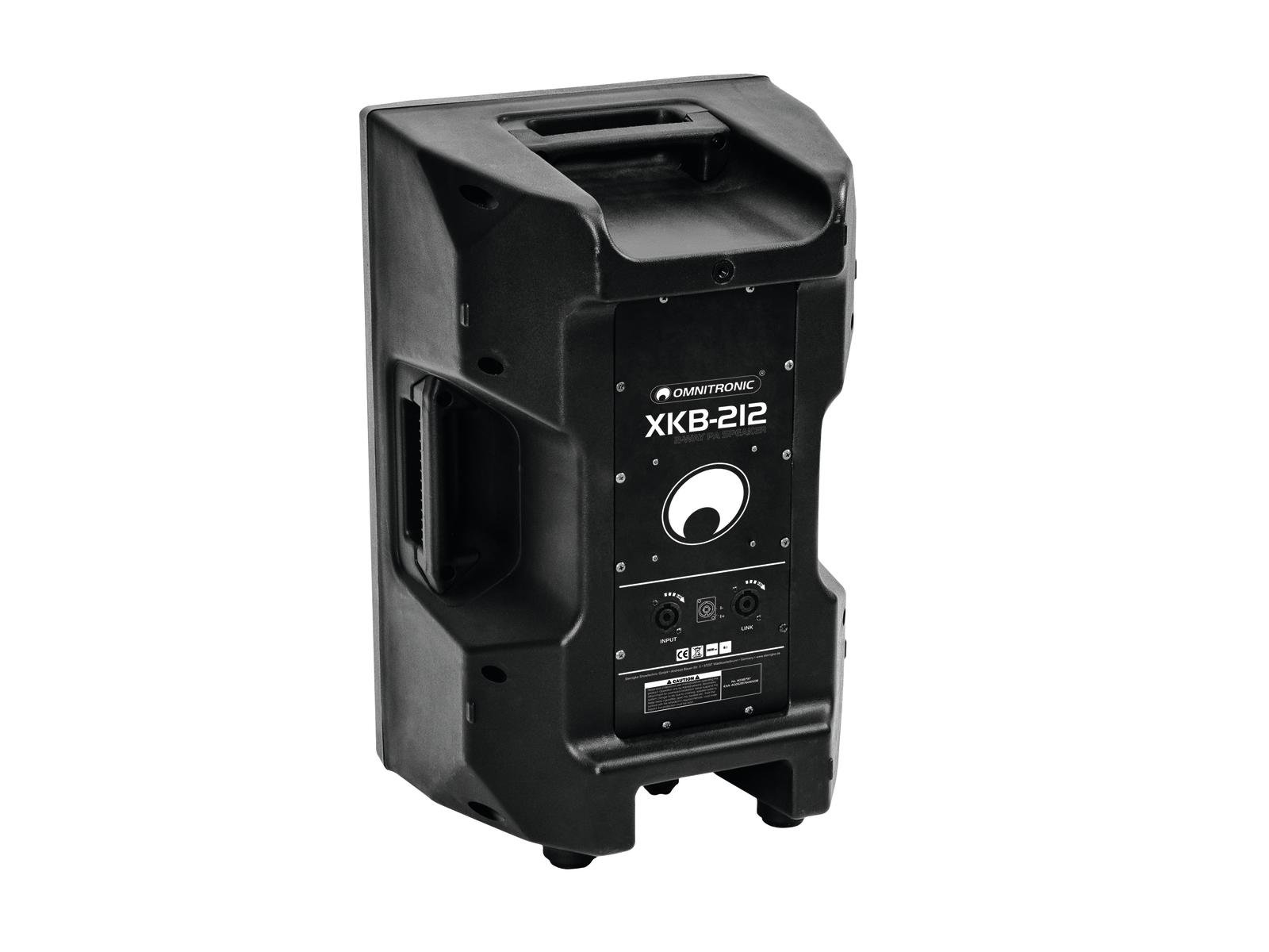 Passive speaker with 300 W RMSThe OMNITRONIC XKB-212 2-way speaker is ideal for your mobile live and DJ applications. The 2-way bass reflex system is equipped with a 30 cm woofer and a 3.5 cm titanium driver and has speaker connections.The stable plastic housing with protective grille and carrying handles has a mounting flange for easy tripod mounting.Use the speaker standing up as a floor monitor or on a speaker stand. Of course you can also mount the XKB-212 on a wall bracket.The nominal power handling capacity is 300 Watt RMS.