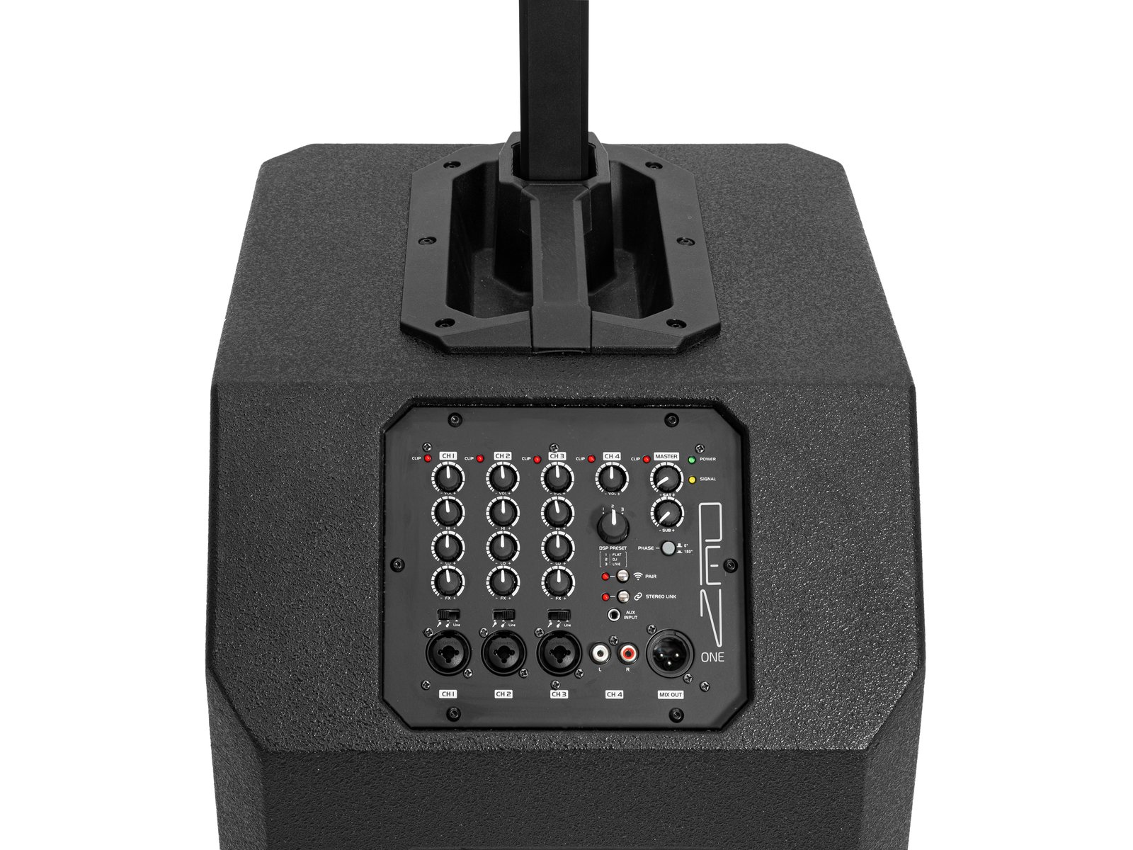 PEN ONE is an active column PA system with a high-power subwoofer with 4-channel power mixer and a full-range column speaker for mobile applications. The system offers three mono inputs (XLR and 6.3 mm jack) for microphones, instruments and line sources, one stereo input (RCA), as well as one AUX input for portable audio players. The amplifier supplies a power of 350 W and 200 W and offers cable-free plug-in connection for the column module. The latest Bluetooth 5.0 technology with TWS support ensures fast and stable wireless connections to Bluetooth audio sources and links two PEN ONE systems for stereo setups.