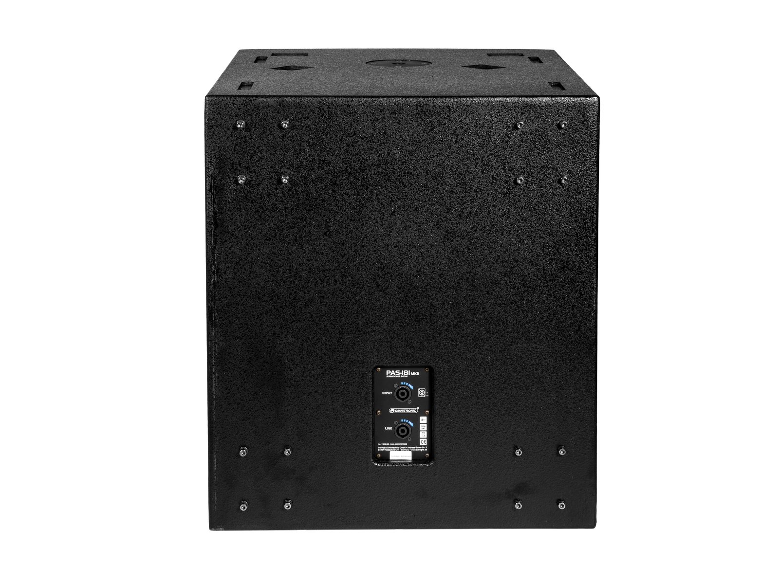 Home SUBWOOFER Passive OMNITRONIC PAS-181 MK3 Subwoofer OMNITRONIC PAS-181 MK3 Subwoofer SKU: 11039490 648,26 € Desconto de %. IVA incluído. Comprar Contactar Adicionar à wishlist Passive 18" bassreflex subwoofer with 900 W RMS, 8 ohmsRugged Pro PA subwooferWheels optionalBlack metal grille with acoustic foam2 mould carrying handlesApplication possibility: StandingPackage contents1 x user manual, 1 x bassPower:Program: 1800WRated: 900W RMSFrequency range:38 - 200 HzSensitivity:98 dB (1W/1m)Max. SPL:130 dBImpedance:8 ohmsAttachment system:Flange: M20 threadConnections:Input: speaker via 2 x speaker built-in socket (F)Speaker:1 x woofer (18") approx. 45 cm with ferrit magnetBasket material: aluminumVoice coil lows (4") approx. 10 cmType of speaker:SubwooferType of construction:VentedMould carrying handle:2 pc/pcsTransport aid:Wheels optionalMaterial:Birch multiplexColor:Black, textured coating, paintedDimensions:Width: 54 cmDepth: 68 cmHeight: 63 cmWeight:42,70 kg Marca Omnitronic Tags OMNITRONICPAS-181MK3Subwoofer Características Partilhar