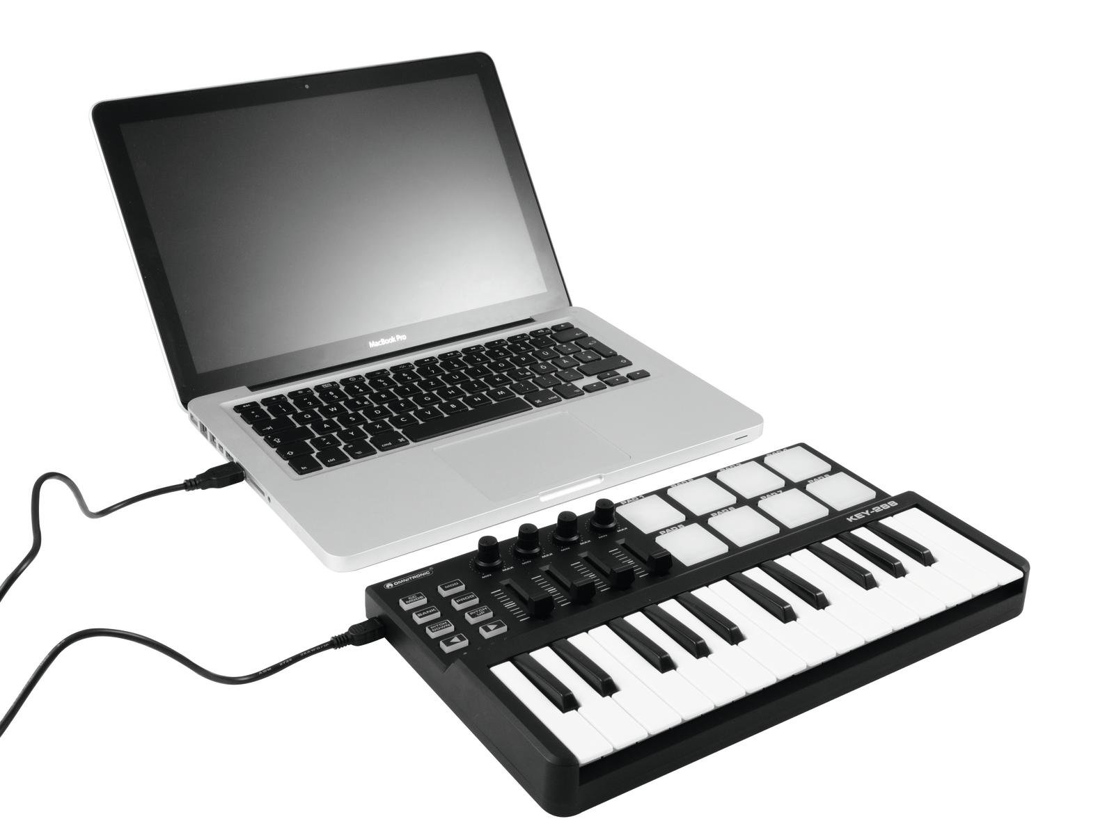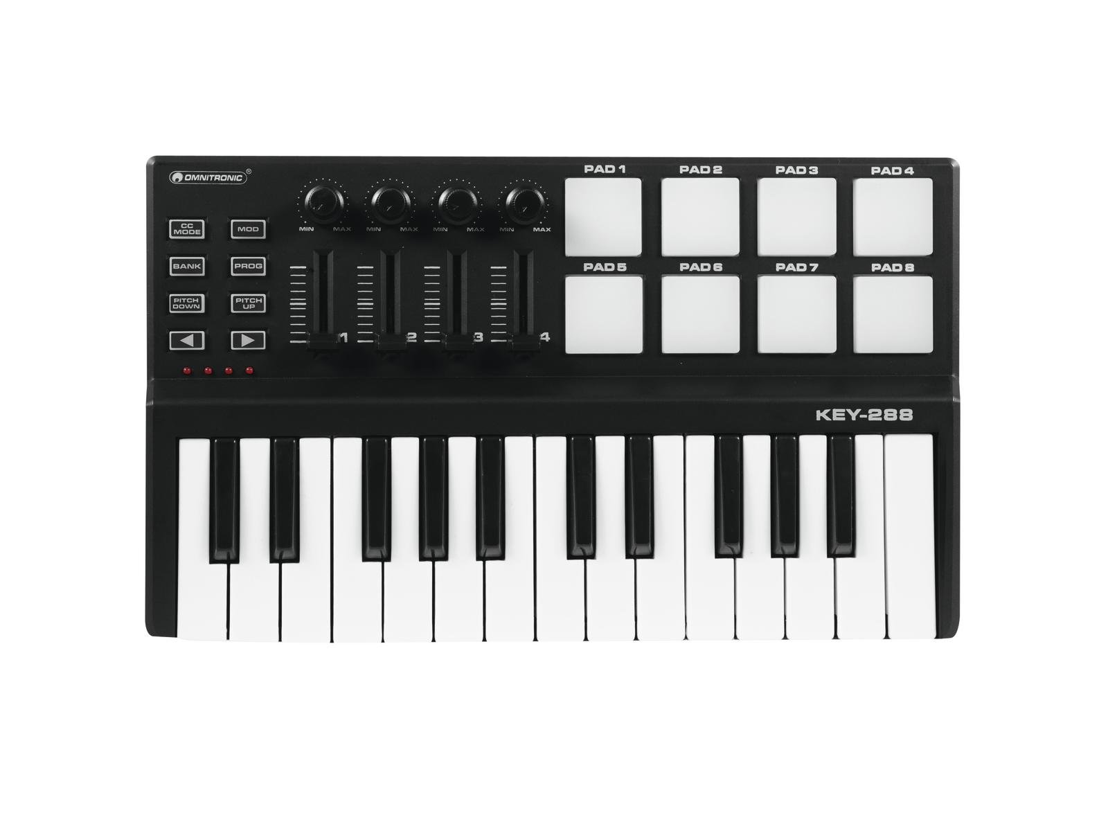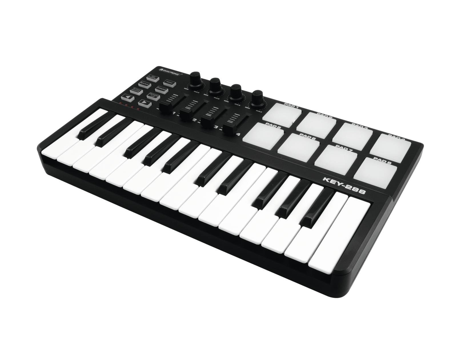 Home MIDI controller OMNITRONIC KEY-288 MIDI Controller OMNITRONIC KEY-288 MIDI Controller SKU: 11045080 104,50 € Desconto de %. IVA incluído. Comprar Contactar Adicionar à wishlist USB MIDI controller with 25 buttons, 8 pads, 4 controls and faders each, for musicians, producers and DJsUSB MIDI keyboard for creative music production with PC and MacAlso suitable for enlarging DJ setsSuper portable format fits laptop bagsWorks with virtually any audio software25 velocity-sensitive mini keyboard keys, velocity curve adjustable8 backlit, velocity-sensitive drum pads can send note, MIDI CC or program change4 freely assignable rotary controls4 freely assignable faders4 programmable memory banksOctave up/down, transposePitch modulationProgram changeControl via plug and playThe device can be connected via USB to the PCMidi capableCompatible with Win XP, Win Vista, Win 7, Win 10, OS X 10,3 or betterPackage contents1 x controller, 1 x uSB cable, 1 x cD, 1 x user manualPower supply:5 V DC 500 mAControl:Plug and playUSB port:USB 2.0, Typ Mini USB (F) mounting versionPC connect:Via USBMidi capableDimensions:Width: 32 cmDepth: 19 cmHeight: 4,5 cmWeight:790 gOperating system:Win XP, Win Vista, Win 7, Win 10, OS X 10,3 or better Marca Omnitronic Tags OMNITRONICKEY-288MIDIControllerControladoromnitrônico-288 Características Partilhar