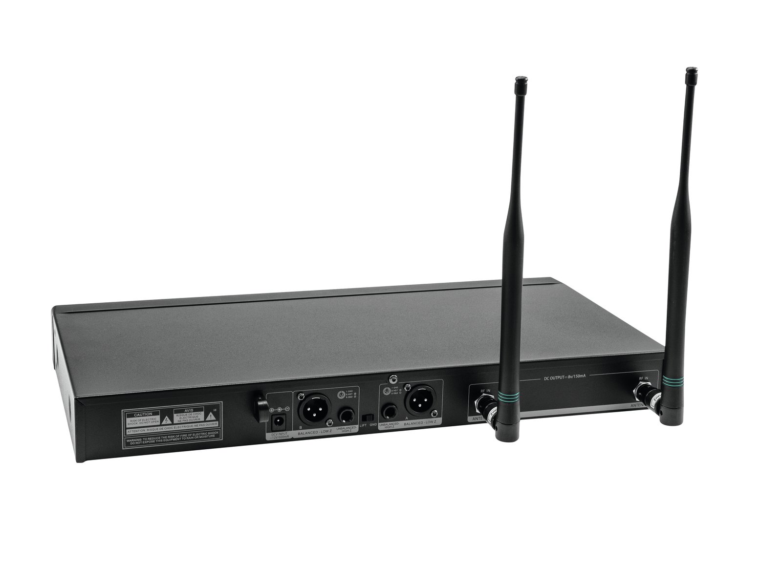 | Connections: | Output: line via 2 x 3-pin XLR Output: line via 2 x 6.3 mm plug (unbal.) Antenna via 2 x BNC (F) 8 V |
