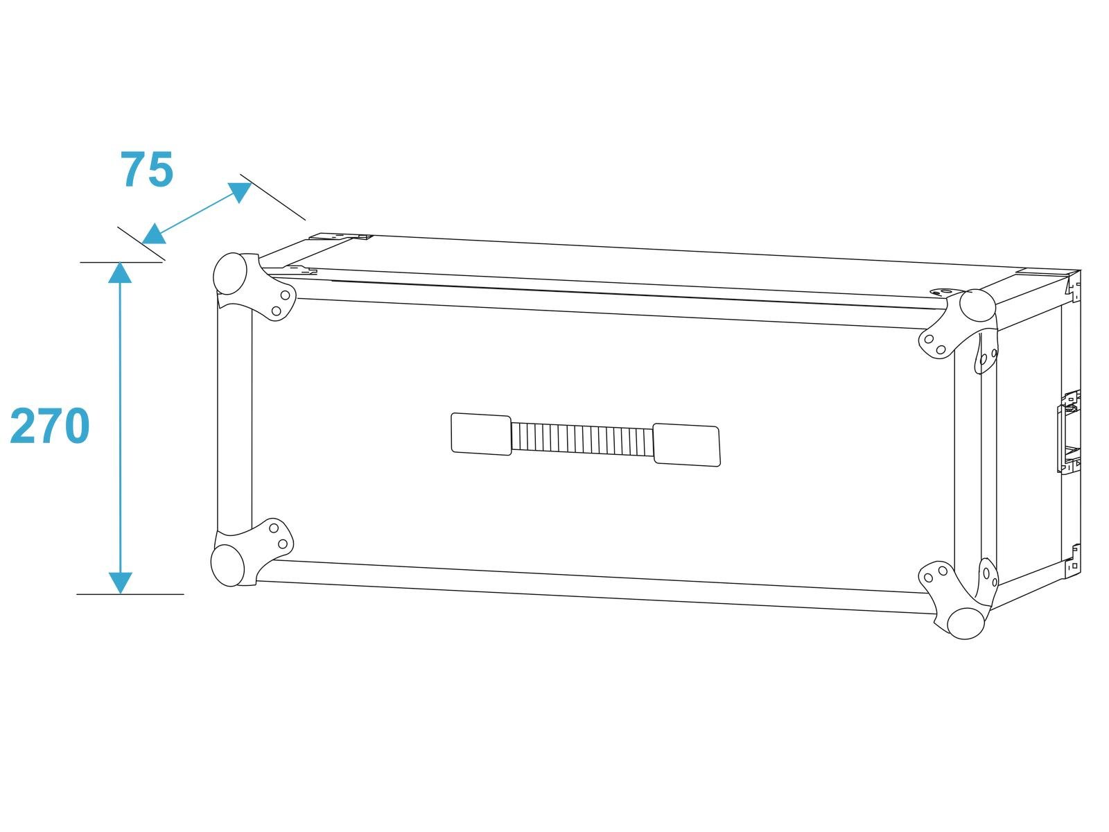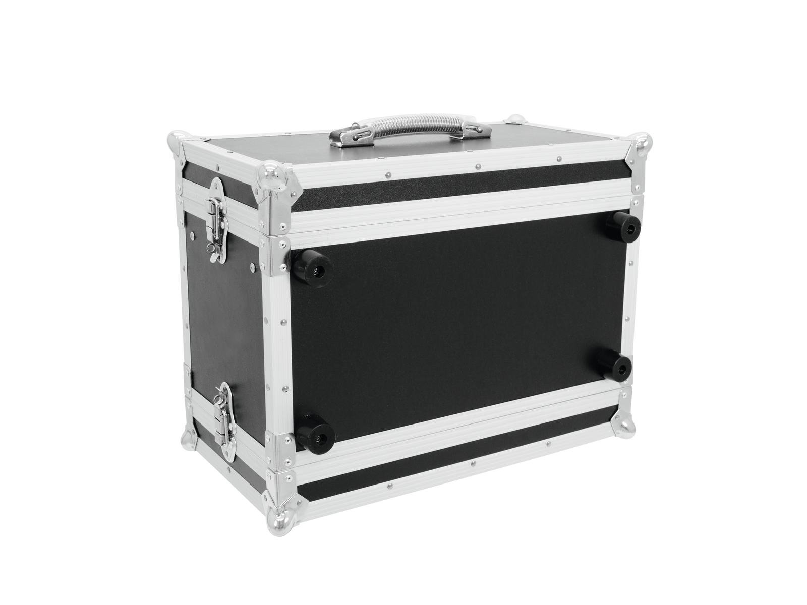 Flightcase for 483 mm units (19")Transport your 483 mm control and effect units (19") easily and safely with the ROADINGER effect rack CO DD. Two removable lids (double-door version), four large, steel-reinforced rubber feet and built-in rack rails make handling with the flightcase easy and comfortable.Multi-layered glued wood, the stable aluminium profile frame with rounded corners and three-legged, medium-sized steel ball corners give the case stability.The flight case is equipped with four snap locks with eyelets for locking, built-in rack rails and a handle. The maximum load is 25 kg.