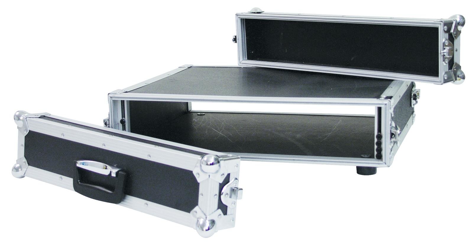 Flightcase for 483 mm units (19")Transport your 483 mm control and effect units (19") easily and safely with the ROADINGER effect rack CO DD with 40 cm depth. Two removable lids (double-door version), four large, steel-reinforced rubber feet and built-in rack rails make handling with the flightcase easy and comfortable.Multi-layered glued wood, the stable aluminium profile frame with rounded corners and three-legged, medium-sized steel ball corners give the case stability.The flight case is equipped with four snap locks with eyelets for locking, built-in rack rails and a case handle. The maximum load is 20 kg.