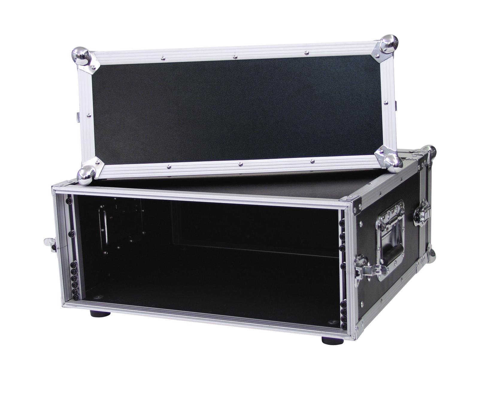 Flightcase for 483 mm units (19")The ROADINGER CO DD Effect Rack with four height units is ideal for safely storing your 483 mm control and effect units. The two lids are removable and it includes built-in rack rails.The high-quality workmanship with multi-layered glued wood is underlined by the aluminum profile frame with rounded corners. The three-legged, medium-sized steel ball corners and the four large, steel-reinforced rubber feet provide the necessary stability. In addition, the flight case is equipped with two chrome-plated case folding handles and four snap locks with eyelets for locking.The delivery includes mounting screws.The maximum load is 20 kg.