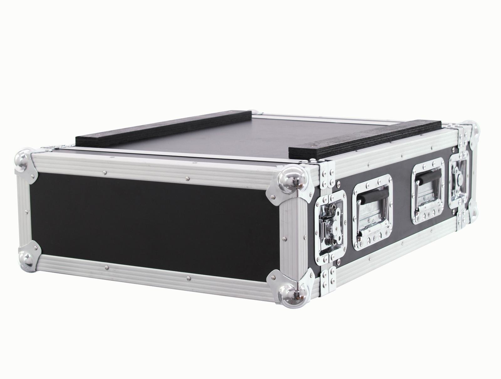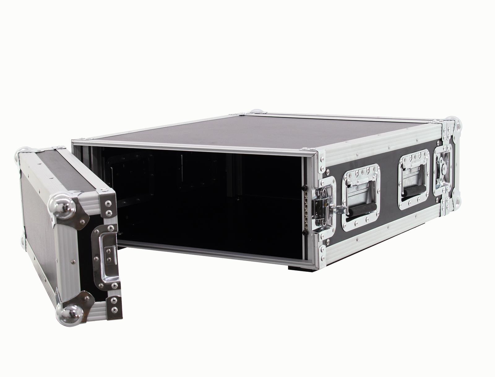 Flightcase for 483 mm devices (19")The ROADINGER amplifier rack PR-2ST including rack rails with 4 U is ideally suited for your 19" equipment such as power amplifiers and other additional equipment. The maximum installation depth is 550 mm plus 90 mm per cover. The high-quality workmanship with multi-layer glued wood and the aluminium profile frame with rounded corners as well as the three-legged, medium-sized steel ball corners provide stability. The amplifier rack is equipped with four high-quality butterfly locks, four chrome-plated case folding handles and two wooden sliding rails on the bottom. Both lids are removable (double door version).The maximum load is 50 kg.