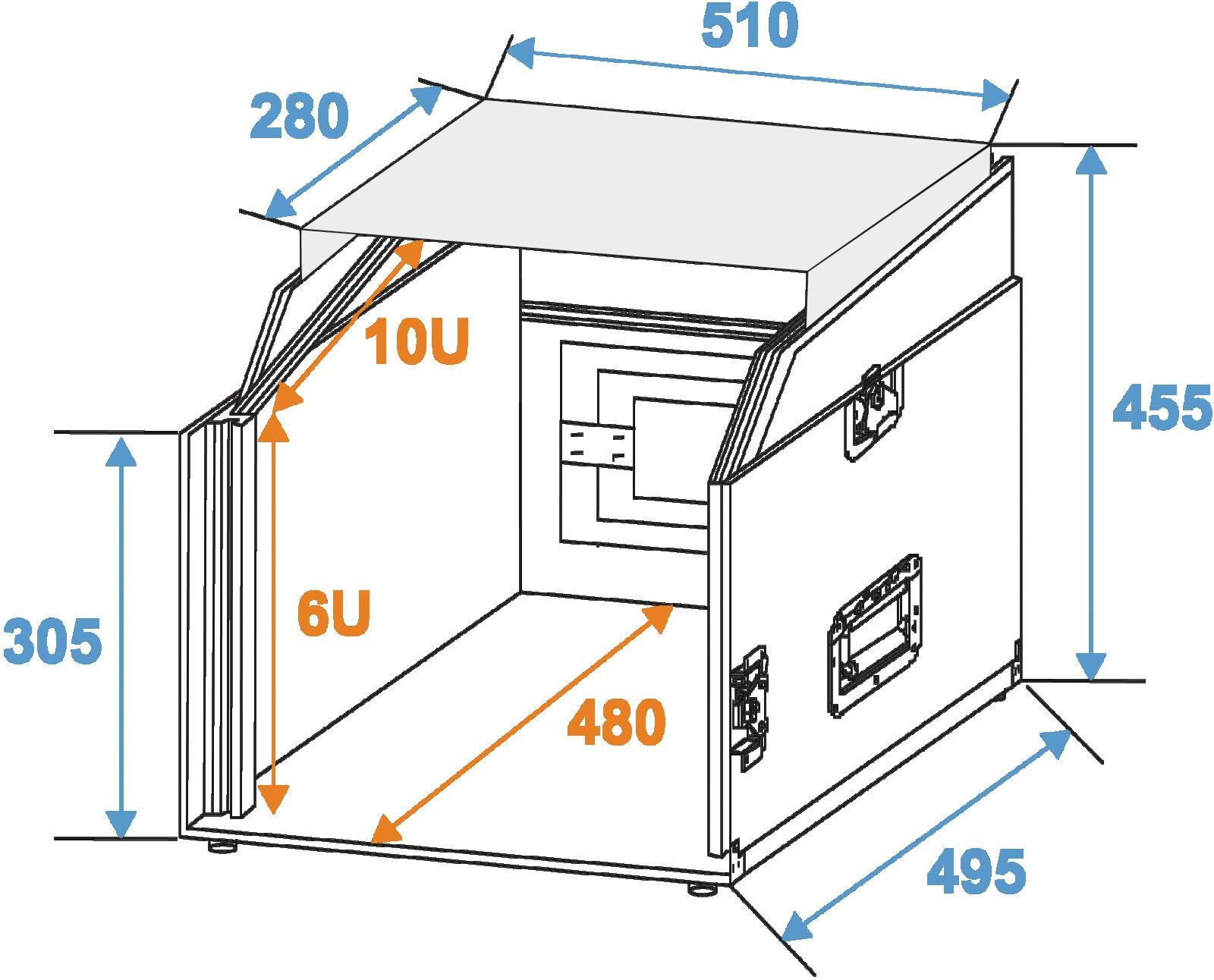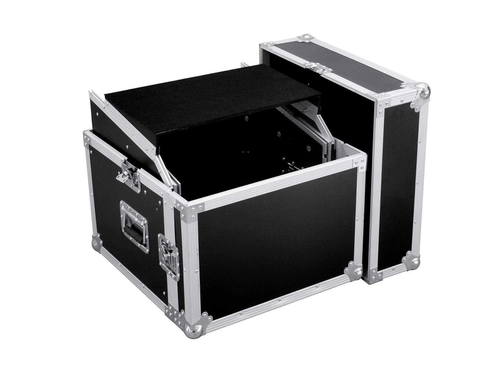 Flightcase for 483 mm units, with notebook trayThe special combi-case LS5 from ROADINGER is suitable for your 483 mm devices such as controllers and mixing consoles with 10 U horizontally and 6 U vertically. The slanted profile rail with 10 U and the removable lid allow you to operate your device from above. In addition, the case has a non-slip, sliding shelf for all standard laptop sizes. The high-quality workmanship of the case with 9 mm wall thickness, aluminium profile frame with rounded corners and three-legged, medium-sized steel ball corners ensures stability. The case is also equipped with four high-quality butterfly locks and two case folding handles. The case can be loaded with a maximum of 50 kg.