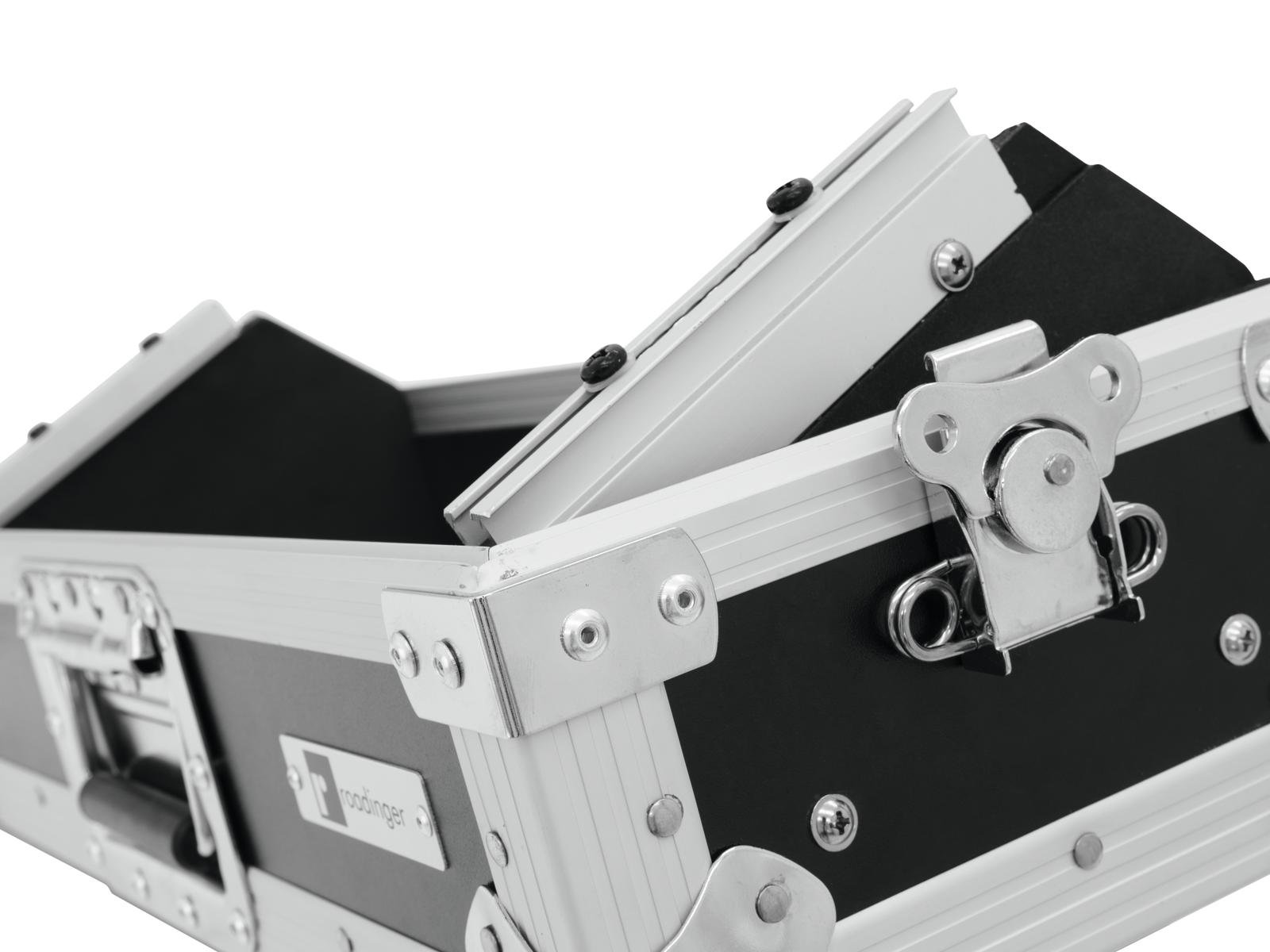 Flightcase for 483 mm units (19")With the ROADINGER Mixer-Case Profi, your devices, such as controllers or mixing consoles, are always well stored. The angled profile rails, which are inclined at an angle of approx. 13°, ensure optimum operation of the unit from above.The necessary stability is provided by the aluminium profile frame with rounded corners and the four steel-reinforced rubber feet. You can close the case with two high-quality butterfly locks.The interior of the mixer case has a foam padded interior so that your appliances are always optimally protected. The cover is removable.The maximum load is 25 kg.