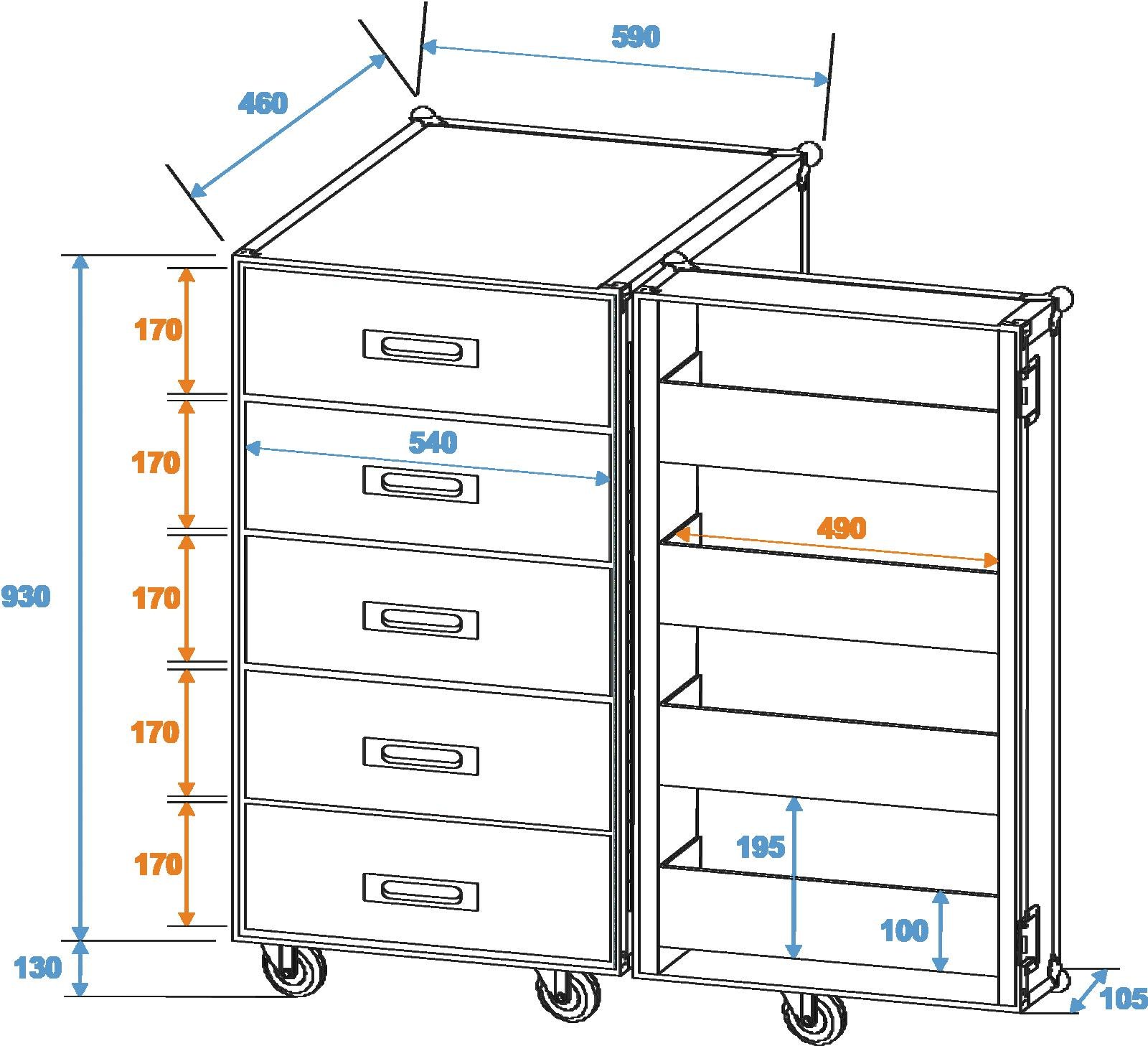 Home Flightcases ROADINGER Universal Drawer Case TSF-1 with wheels ROADINGER Universal Drawer Case TSF-1 with wheels SKU: 30126428 848,40 € Desconto de %. IVA incluído. Comprar Contactar Adicionar à wishlist Drawer case with castors5 drawers (3 with individually adjustable dividers, 2 with black felt cover)Foldable cover with 4 deposition compartments and additional castorWith 5 DrawersHigh-quality workmanship with plywood multi-layer glued 9 mm, black, laminatedAluminum profile frames 30mm with rounded edges4 hinged, chromium plated case handles2 high-quality butterfly locks with shut-off function5 castors with 2 locking brakesFor further information about this product, please refer to the Data Sheet under "Downloads"Maximum load:100 kgAluminum profile frames:30 mmCase handle:4 pc/pcsLock:Butterfly lock: 2 pc/pcs with shut-off functionTransport aid:5 x castors with 2 locking brakesMaterial:Plywood multi-layer glued, 9 mmColor:Black, laminatedDrawer:54 cm x 44 cm x 17 cmCompartment dimensions:49 cm x 17 cmDimensions:Width: 59 cmDepth: 56 cmHeight: 1,07 mWeight:59,40 kg Marca Roadinger Tags ROADINGERUniversalDrawerCaseTSF-1withWheelsCASOdagavetadecomrodas Partilhar