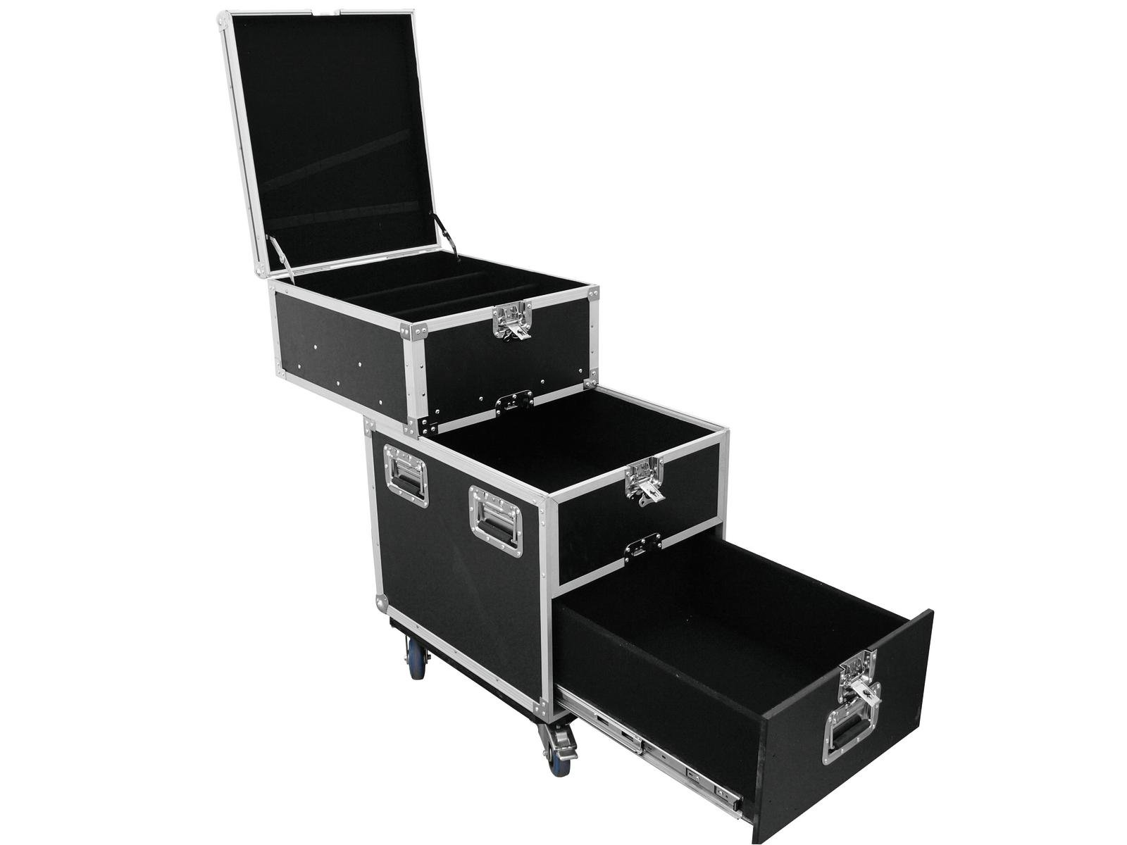 Shows what it's got!There are cases, that are not able to offer anything more than five walls and one door. But our universal roadie case is different. Besides its three spacious sections - moreover the top section is divided in three parts - this beaut holds a special highlight: all three sections can be opened and used at the same time. At the bottom a drawer is pulled out to the front and at the top the section ist pulled to the back. Et voilà! All utensils stored in the case can be used at any time. Withal, heavy itmes can be placed in the strong middle section.