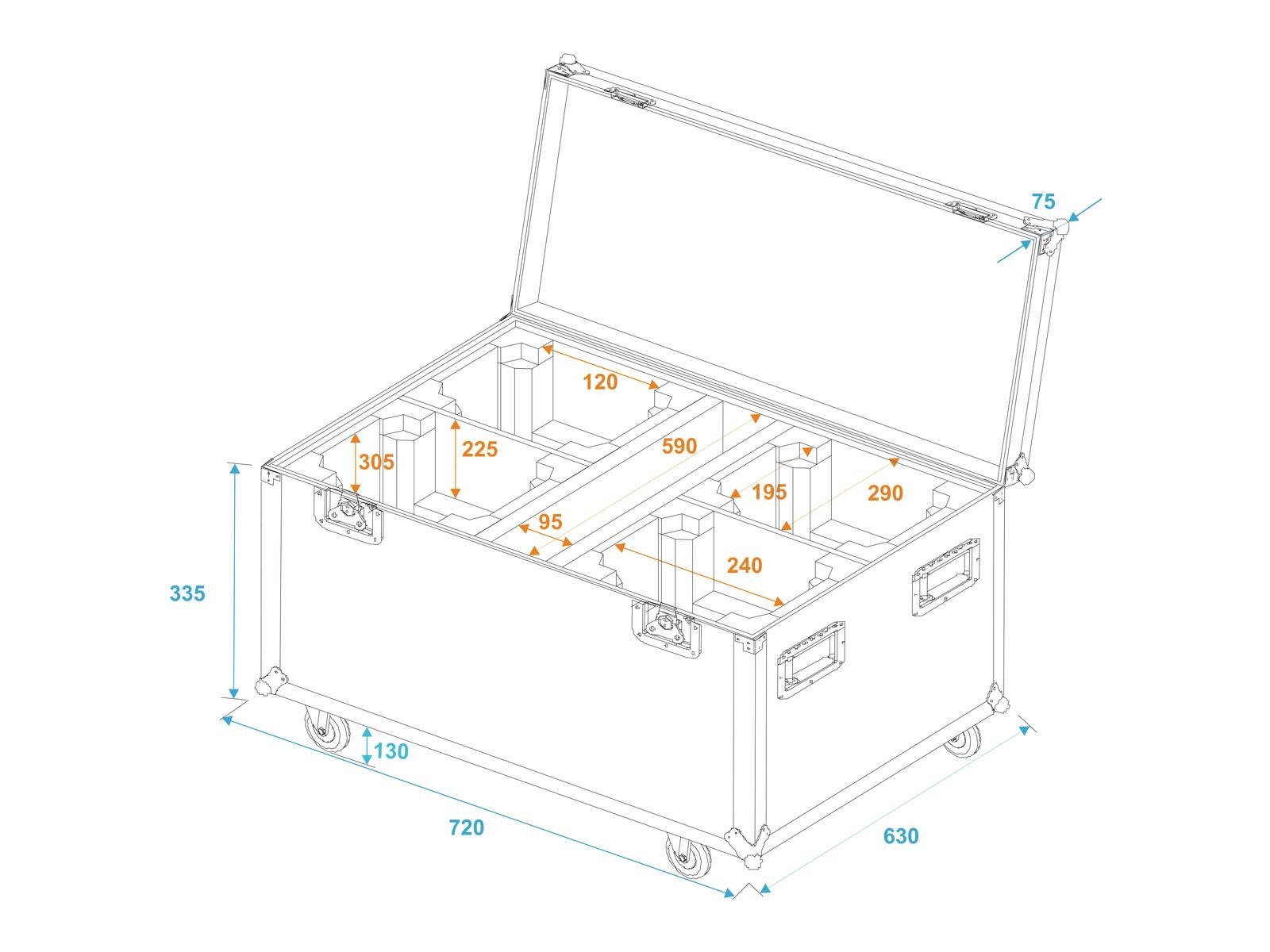 Home Flightcases ROADINGER Flightcase 4x TMH FE-600 with wheels ROADINGER Flightcase 4x TMH FE-600 with wheels SKU: 31005087 529,59 € Desconto de %. IVA incluído. Comprar Contactar Adicionar à wishlist PRO flightcase case for 4 x TMH FE-600With accessory compartmentWith 2 Device compartmentsWith 4 Device compartmentsHigh-quality workmanship with birch multiplex 7 mm, dark brown, laminatedInterior with foam paddingAluminum profile frames 25mm with rounded edges4 hinged, chromium plated case handles2 chrome tip-over locks2 high-quality butterfly locks4 castors with 2 locking brakes4 built-in stacking trays in the coverBranded hardwareMade in EuropeFor further information about this product, please refer to the Data Sheet under "Downloads"Maximum load:100 kgAluminum profile frames:25 mmCase handle:4 pc/pcsStop hinge:2 pc/pcsLock:Butterfly lock: 2 pc/pcsTransport aid:4 x castors with 2 locking brakes4 x built-in stacking trays in the coverUse of brands:Branded hardwareMaterial:Birch multiplex, 7 mmColor:Dark brown, laminatedDevice compartment:24 cm x 19,5 cm x 30,5 cmMiddle compartment:9,5 cm x 59 cm x 30,5 cmInside dimensions:57,5 cm x 29 cm x 30,5 cmDimensions:Width: 72 cmDepth: 64 cmHeight: 55 cmWeight:22,71 kg Marca Roadinger Tags ROADINGERFlightcase4xTMHFE-600withWheelscomrodas Características Partilhar
