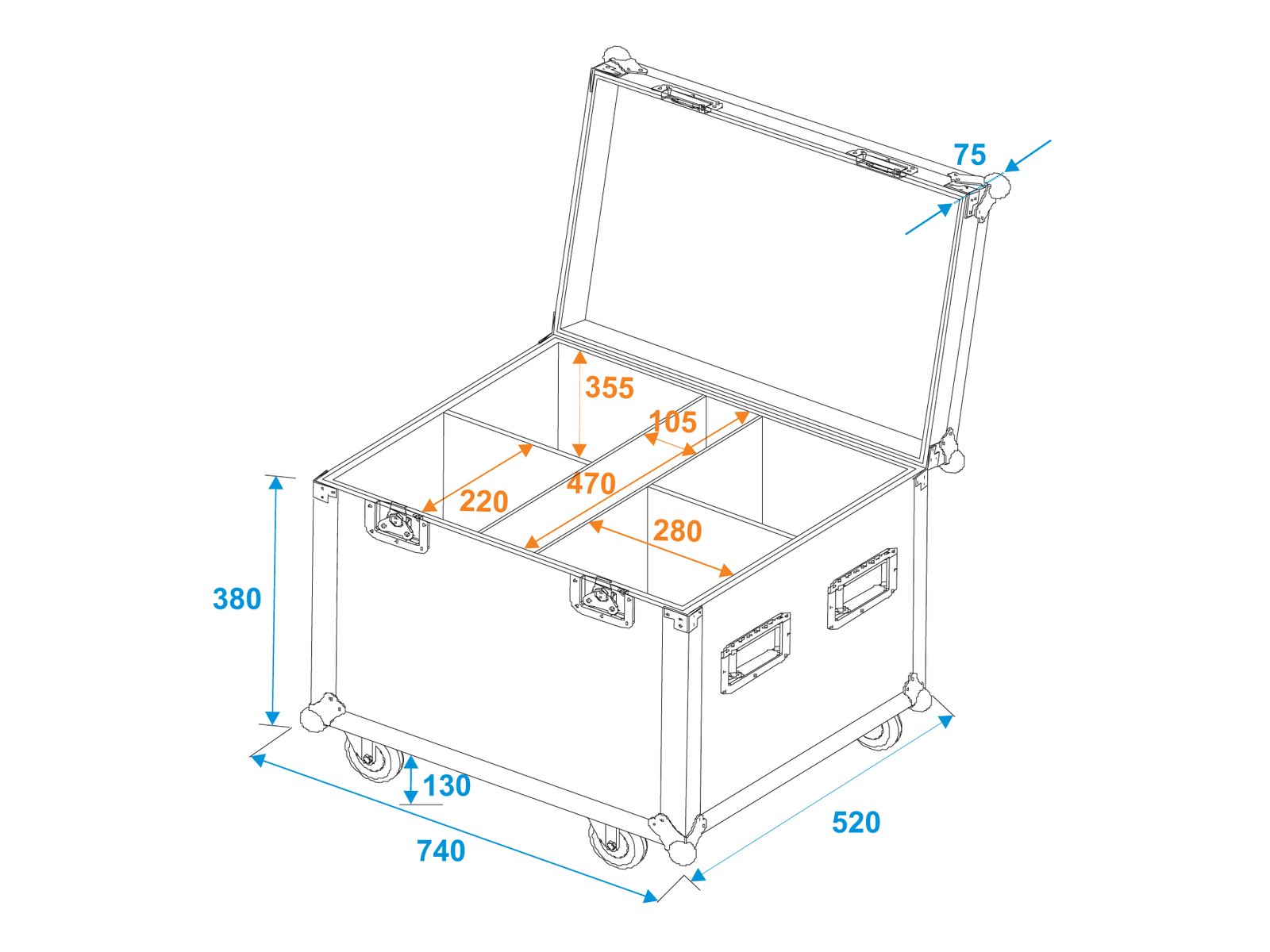 Home Flightcases ROADINGER Flightcase 4x LED Theatre COB 200 series, with wheels ROADINGER Flightcase 4x LED Theatre COB 200 series, with wheels SKU: 31005195 612,84 € Desconto de %. IVA incluído. Comprar Contactar Adicionar à wishlist PRO Flightcase for 4x LED Theatre COB 200 series, with wheelsHigh-quality workmanship with birch multiplex 6,5 mm,Interior with foam paddingAluminum profile frames 30mm with rounded edges4 hinged, chromium plated case handles2 chrome tip-over locks2 high-quality butterfly locks4 castors with 2 locking brakes4 built-in stacking trays in the coverBranded hardwareMade in EuropeFor further information about this product, please refer to the Data Sheet under "Downloads"Package contents1 x caseMaximum load:100 kgAluminum profile frames:30 mmCase handle:4 pc/pcsStop hinge:2 pc/pcsLock:Butterfly lock: 2 pc/pcsTransport aid:4 x castors with 2 locking brakes4 x built-in stacking trays in the coverUse of brands:Branded hardwareMaterial:Birch multiplex, 6,5 mmAccessory compartment:10,5 cm x 47 cm x 35,5 cmDevice compartment:28 cm x 22 cm x 35,5 cmInside dimensions:66,5 cm x 47 cm x 35,5 cmDimensions:Length: 73,5 cmDepth: 51 cmHeight: 57 cmWeight:20,40 kg Marca Roadinger Tags ROADINGERFlightcase4xLEDTheatreCOB200SerieswithWheelscomrodas Partilhar
