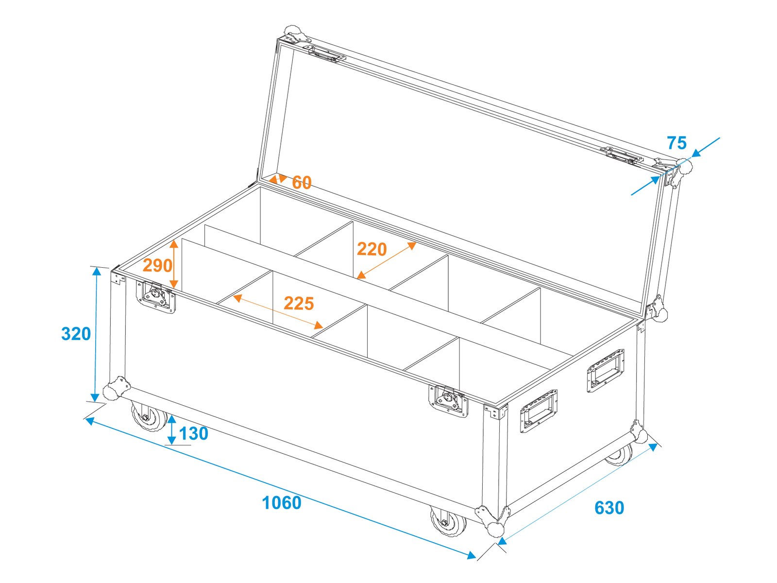 Home Flightcases ROADINGER Flightcase 8x LED IP PAR 7x8W QCL/7x9W SCL with wheels ROADINGER Flightcase 8x LED IP PAR 7x8W QCL/7x9W SCL with wheels SKU: 31005199 618,15 € Desconto de %. IVA incluído. Comprar Contactar Adicionar à wishlist Trunk case with castors, PRO versionWith 8 Device compartmentsWith accessory compartmentHigh-quality workmanship with birch multiplex 6,50 mm, black, laminatedInterior with foam paddingAluminum profile frames 25mm with rounded edges4 hinged, chromium plated case handles3 chrome tip-over locks2 high-quality butterfly locks4 castors with 2 locking brakes4 built-in stacking trays in the coverBranded hardwareMade in EuropeFor further information about this product, please refer to the Data Sheet under "Downloads"Maximum load:100 kgAluminum profile frames:25 mmCase handle:4 pc/pcsStop hinge:3 pc/pcsLock:Butterfly lock: 2 pc/pcsTransport aid:4 x castors with 2 locking brakes4 x built-in stacking trays in the coverUse of brands:Branded hardwareMaterial:Birch multiplex, 6,50 mm, laminatedColor:Black, laminatedDevice compartment:22,5 cm x 24 cm x 30 cmAccessory compartment:1,01 m x 10,5 cm x 28 cmDimensions:Length: 1,05 mDepth: 63 cmHeight: 51 cmWeight:26,40 kg Marca Roadinger Tags ROADINGERFlightcase8xLEDIPPAR7x8WQCL/7x9WSCLwithWheelscomrodas Características Partilhar