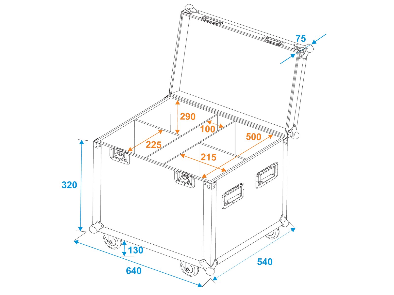 Home Flightcases ROADINGER Flightcase 4x LED IP PAR 7x8W QCL/7x9W SCL with wheels ROADINGER Flightcase 4x LED IP PAR 7x8W QCL/7x9W SCL with wheels SKU: 31005200 522,50 € Desconto de %. IVA incluído. Comprar Contactar Adicionar à wishlist PRO Flightcase for 4x LED IP PAR 7x8W QCL/7x9W SCL with castorsWith 4 Device compartmentsWith accessory compartmentInterior with foam paddingAluminum profile frames 25mm with rounded edges4 hinged, chromium plated case handles2 chrome tip-over locks2 high-quality butterfly locks4 castors with 2 locking brakes4 built-in stacking trays in the coverBranded hardwareMade in EuropeFor further information about this product, please refer to the Data Sheet under "Downloads"Maximum load:100 kgAluminum profile frames:25 mmCase handle:4 pc/pcsStop hinge:2 pc/pcsLock:Butterfly lock: 2 pc/pcsTransport aid:4 x castors with 2 locking brakes4 x built-in stacking trays in the coverUse of brands:Branded hardwareMaterial:Birch multiplexColor:Dark brown, laminatedDevice compartment:21,5 cm x 22,5 cm x 29 cmAccessory compartment:10 cm x 50 cm x 29 cmInside dimensions:53 cm x 50 cm x 29 cmMaterial thickness:6,5 mmDimensions:Width: 62,50 cmDepth: 53,50 cmHeight: 51,50 cmWeight:17,75 kg Marca Roadinger Tags ROADINGERFlightcase4xLEDIPPAR7x8WQCL/7x9WSCLwithWheelscomrodas Características Partilhar