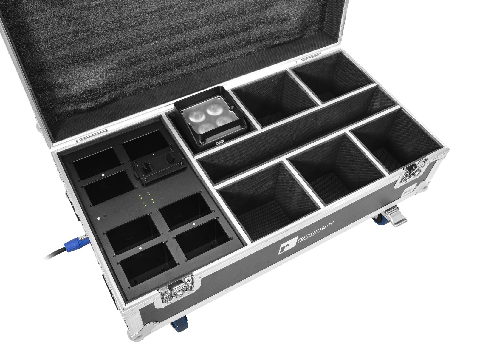 Home Flightcases ROADINGER Flightcase 6x AKKU IP UP-4 Plus HCL Spot WDMX with Charging Function ROADINGER Flightcase 6x AKKU IP UP-4 Plus HCL Spot WDMX with Charging Function SKU: 31005215 812,98 € Discount of %. IVA included. Buy Contact Add to wishlist Trunk case with castorsInterior with foam paddingAluminum profile frames 25mm with rounded edges4 hinged, chromium plated case handles2 chrome tip-over locks2 high-quality butterfly locks4 castors with 2 locking brakes4 built-in stacking trays in the coverPackage contents1 x case, 1 x power cord, 1 x user manualPower supply:100-240 V AC, 50/60 HzPower connection:Mains input via P-Con (blue), mounting version power supply cord with safety plug (provided)Fuse:5 x 20 mm, F 5 A Fuse replaceableStatus LED:Charge status indicatorAluminum profile frames:25 mmCase handle:4 pc/pcsStop hinge:2 pc/pcsLock:Butterfly lock: 2 pc/pcsTransport aid:4 x castors with 2 locking brakes4 x built-in stacking trays in the coverMaterial:Plywood multi-layer gluedColor:Black, laminatedDevice compartment:17,1 cm x 15 cm x 21 cmAccessory compartment:55,5 cm x 7,8 cm x 21 cmDimensions:Length: 92,5 cmWidth: 48,5 cmHeight: 31 cmWeight:22,70 kg Brand Roadinger Tags ROADINGERFlightcase6xAKKUIPUP-4PlusHCLSpotWDMXwithchargingfunctionmaiscomfunçãodecarregamento Share