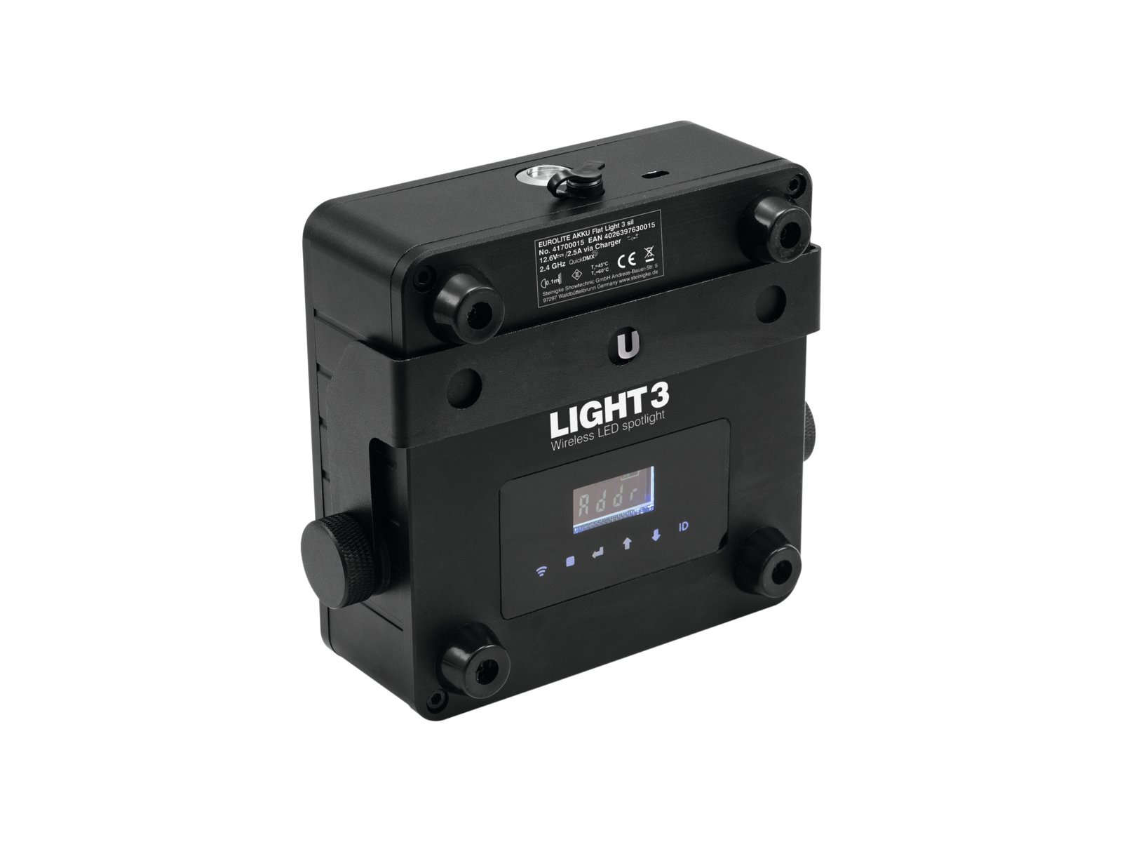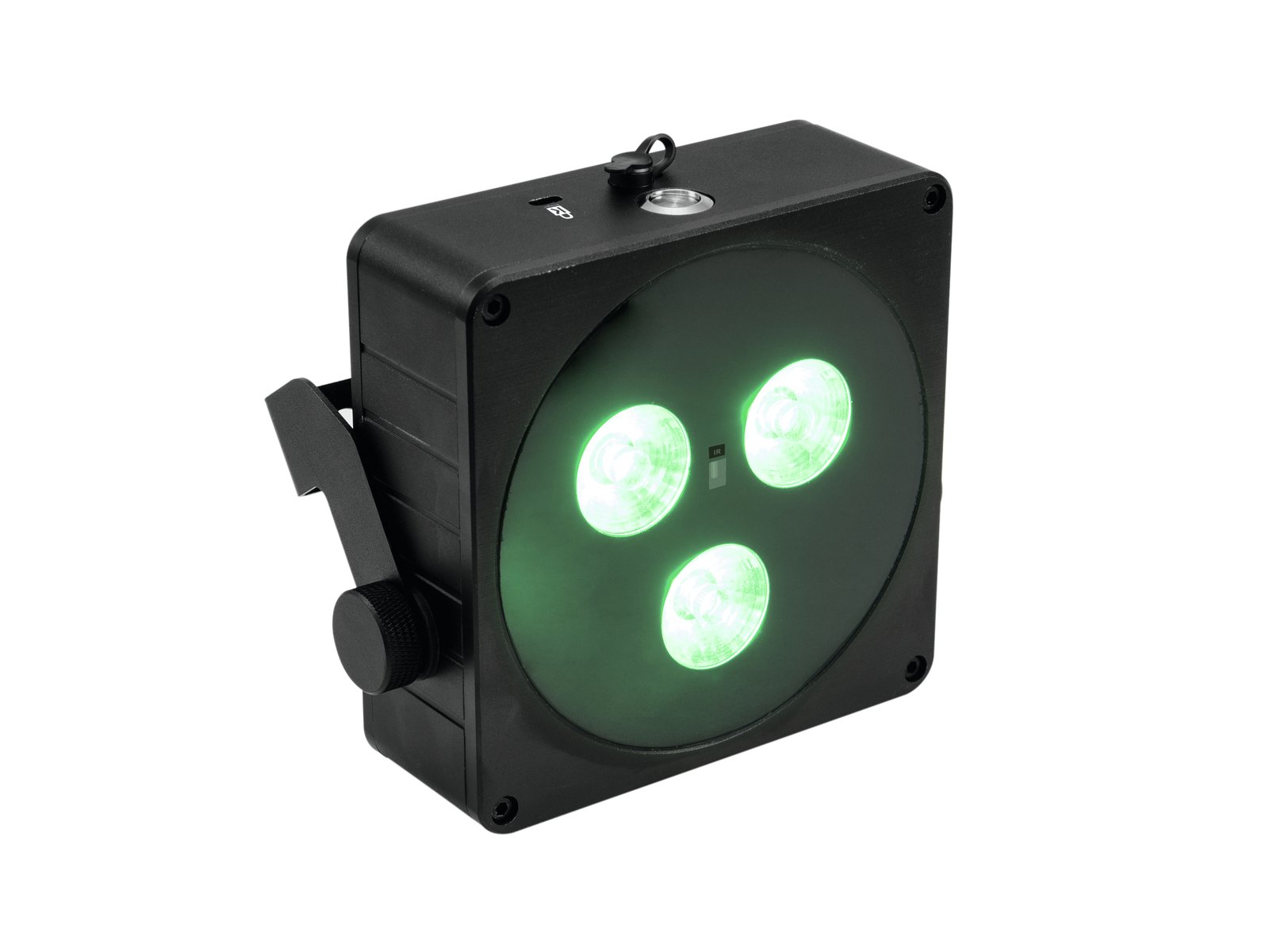 Flat headlight with 3x8 W RGBW LED, Quick DMX transceiver & bracketThe flat spotlight EUROLITE AKKU Flat Light 3 is wireless, flexible and versatile. It is equipped with three powerful 8-watt LEDs (4in1) in red, green, blue and white. If you are looking for a spotlight that does not take up much space and is suitable for use on stages, in discotheques, theatres, bars or even for mobile use, the AKKU Flat Light 3 is the perfect choice.With an operating time of up to 16 hours with the built-in rechargeable battery, the spotlight is ideal for mobile use.The compact and powerful spotlight is housed in an elegant housing. The angle of inclination can be adjusted manually via the bracket.In addition to static colors with infinitely variable RGBW color mixing, you can also use internal programs and a strobe effect with variable speed. The dimmer with adjustable dimmer speed and the music control offer you further possibilities.You can control the Flat Light 3 via DMX with master/slave function, with the supplied infrared remote control, in stand-alone mode and via the integrated QuickDMX radio transmitter/receiver for wireless transmission of DMX512 signals.Addressing and setting can also be conveniently done via the touch-sensitive control board and LCD. In addition, the Flat Light 3 is equipped with a Kensington security connector, with which you can protect your device against theft.