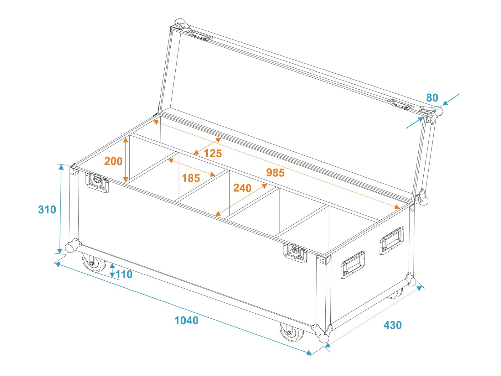 Home Flightcases ROADINGER Flightcase 4x LED Umbrella ROADINGER Flightcase 4x LED Umbrella SKU: 42111100 352,47 € Desconto de %. IVA incluído. Comprar Contactar Adicionar à wishlist Trunk case with castorsWith 4 Device compartmentsHigh-quality workmanship with plywood multi-layer glued 7 mm, red, laminatedInterior with foam paddingAluminum profile frames 30mm with rounded edges4 hinged, chromium plated case handles2 chrome tip-over locks2 high-quality butterfly locks4 castors with 2 locking brakes4 built-in stacking trays in the coverFor further information about this product, please refer to the Data Sheet under "Downloads"Maximum load:100 kgAluminum profile frames:30 mmCase handle:4 pc/pcsStop hinge:2 pc/pcsLock:Butterfly lock: 2 pc/pcsTransport aid:4 x castors with 2 locking brakes4 x built-in stacking trays in the coverMaterial:Plywood multi-layer glued, 7 mmColor:Red, laminatedAccessory compartment:98,5 cm x 12,5 cm x 20 cmDevice compartment:18,5 cm x 24 cm x 20 cmInside dimensions:92,5 cm x 36,5 cm x 20 cmDimensions:Width: 1,04 mDepth: 43 cmHeight: 41 cmWeight:18,50 kg Marca Roadinger Tags ROADINGERFlightcase4xLEDUmbrella Partilhar