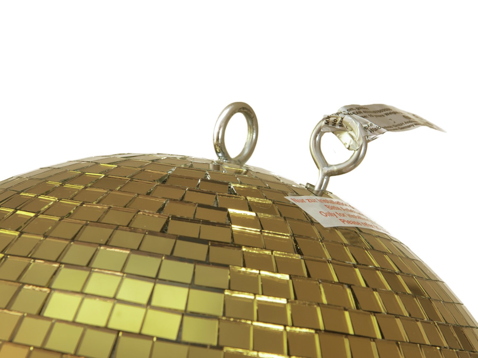 No party without a disco ball! Its simple design and affordable price make the disco ball a popular decoration classic used to create fascinating plays of light on the dance floor. Eurolite offers a wide range of disco balls in different colors and sizes.This model in professional quality has a diameter of 30 cm and is covered with countless small gold-colored mirrors (10 x 10 mm). The robust plastic core is covered with hundreds of small mirror facets and features a continuous shaft guaranteeing a high tensile strength. The mirror ball also includes two eyelets allowing for attaching both the fastening chain and the required fall protection. An additional motor can be used optionally to make the mirror ball rotate automatically. Suitable motors, the required mounting material and a transport case are available as accessories.