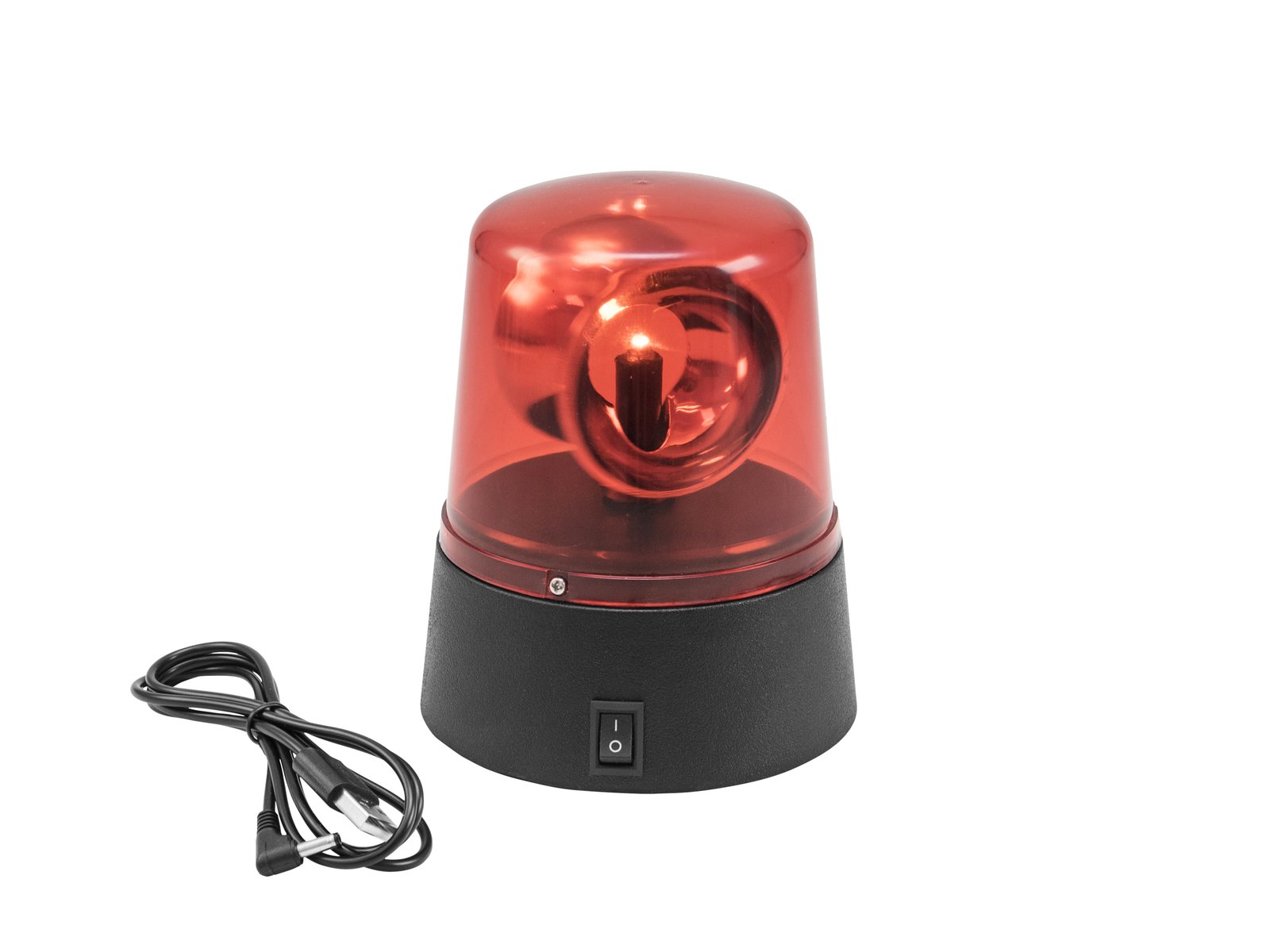 Mini LED rotating beacon for 3 x AA 1,5V battery or USBThe funny rotating beacon EUROLITE LED mini police light always works well as a party gag. Simply connect the included USB cable to the connection on the light and a USB interface. Alternatively, you can also use batteries.Now simply switch on the police light - the reflector turns and the LED begins to light up.