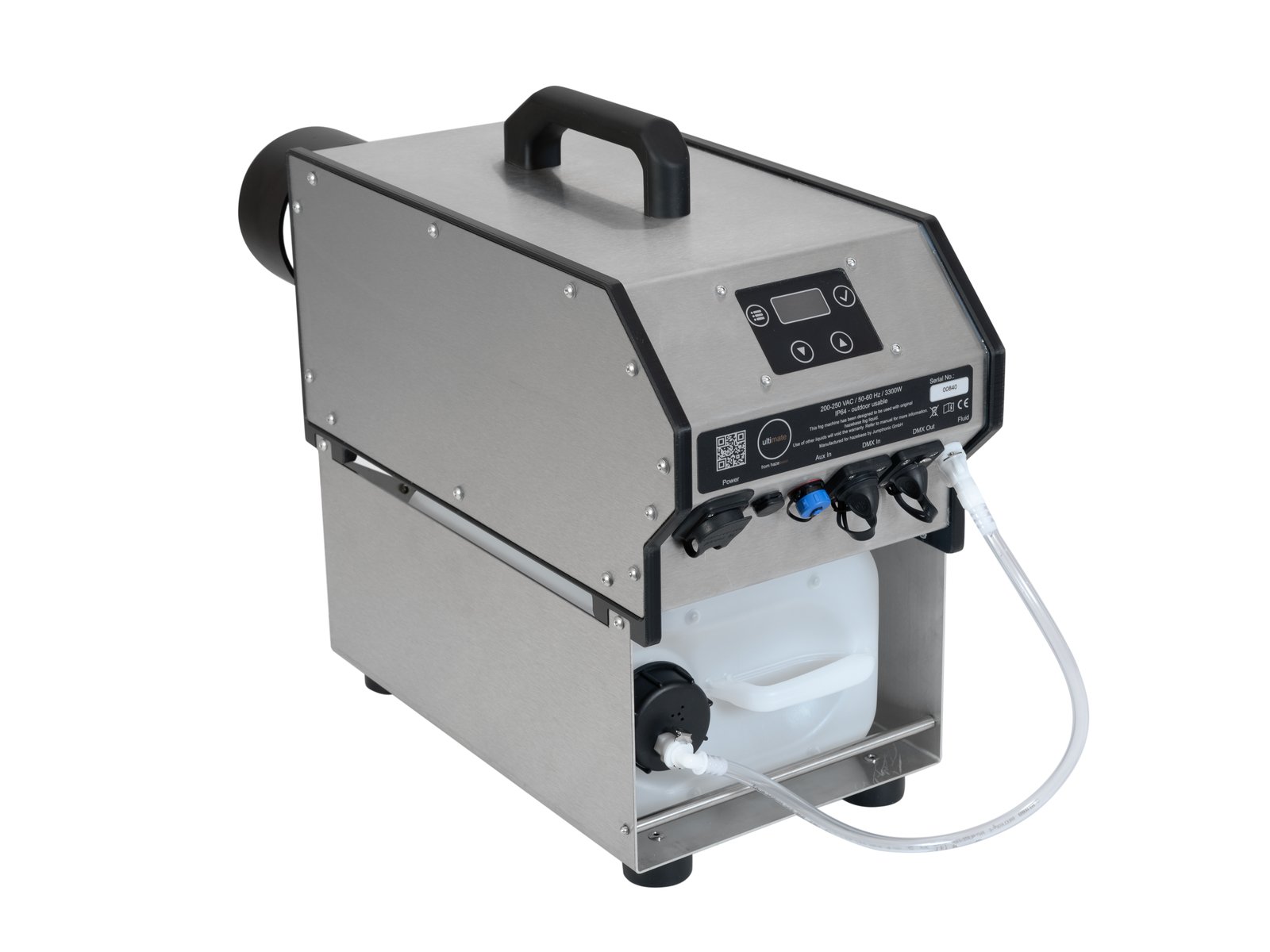 Home Smoke machines HAZEBASE ultimate outdoor fog machine IP64 DMX HAZEBASE ultimate outdoor fog machine IP64 DMX SKU: 51700146 3.363,51 € Desconto de %. IVA incluído. O produto encontra-se sem stock. Adicionar à wishlist Weather-proof 3300 W vaporizing fog machine, IP64, with DMX connectionPowerful outputIntegrated timerPermanent fogging possibleVery precisely controllable due to digital technologySmall dimensionsOnly use original Hazebase fluid for flawless operationOther fluids may damage the unit or cause malfunctionVery short warm-up timeBig tank capacityControl via stand-alone; Timer; DMX; Analog 0-10 VOLED displayMade in GermanyRemovable tankFor application areas such as: Installation; Stage; theater; RentalApplication possibility: StandingFor further information about this product, please refer to the Data Sheet under "Downloads"Package contents1 x device, 1 x power cord, 1 x user manual, 1 x container, 1 x tube, 1 x lidPower supply:230 V AC, 50 HzPower consumption:3300 WIP classification:IP64Protection class:Protection class IPower connection:Via PowerCON TRUE (M) mounting versionWarm-up time:2 secTank capacity:5 l removable tankDMX input:1 x 5-pin XLR (M) mounting version IPControl:Stand-alone; Timer; DMX; Analog 0-10 VOperating principle:Vaporizing fog machineDisplay type:OLED displayColor:GreyDimensions:Width: 20 cmDepth: 48,7 cmHeight: 38,8 cmWeight:13,51 kgNoise classification:Class 2 (slight noise) Marca HAZEBASE Tags HAZEBASEultimateOutdoorFogmachineIP64DMX Características Partilhar