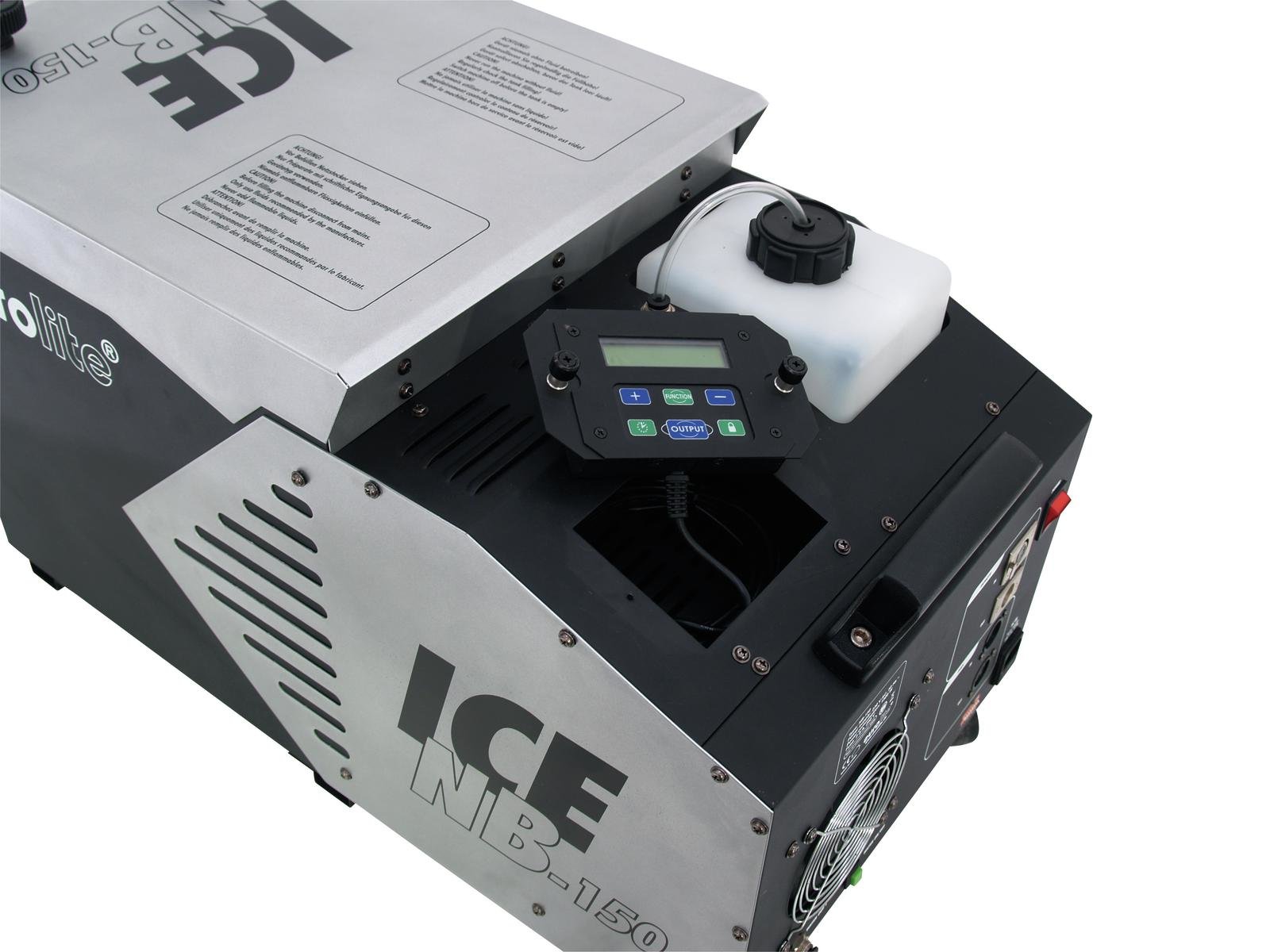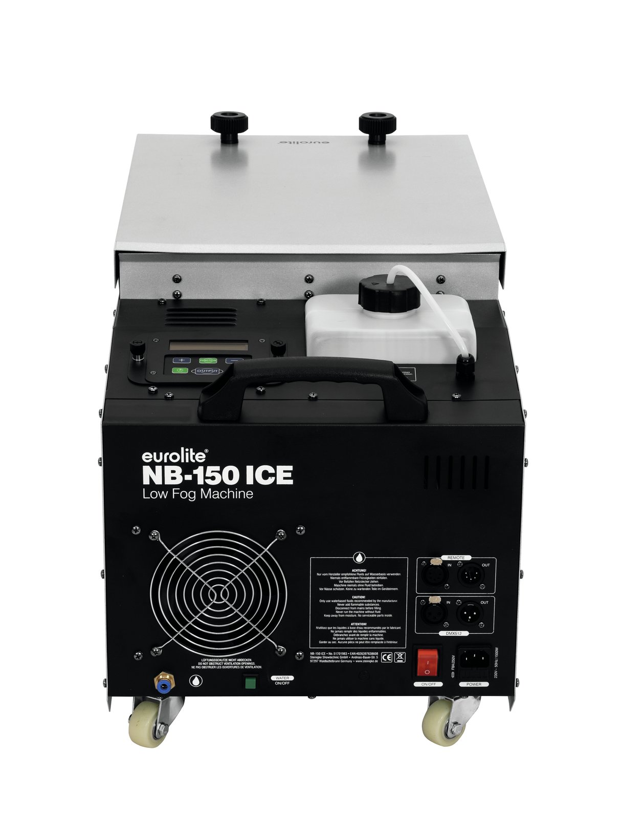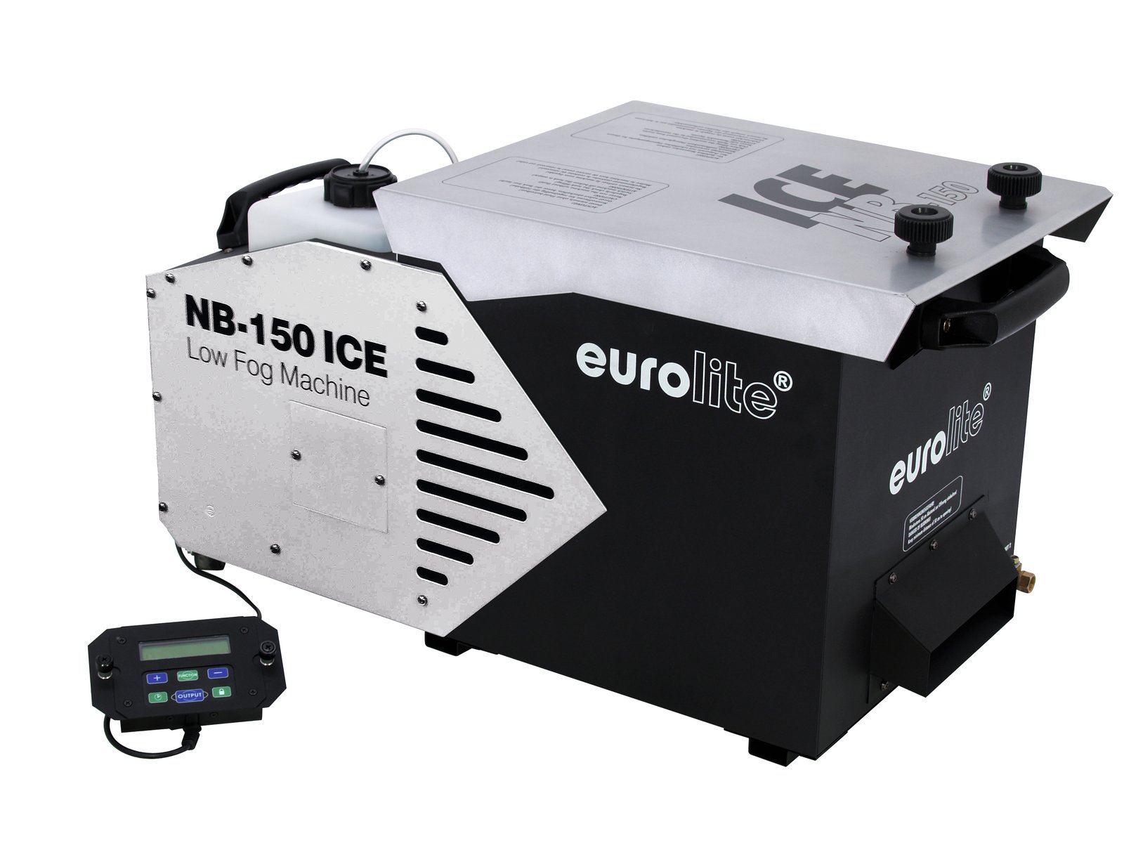 Simple floor fogger with 1500 W, remote control, ice cube coolingThe EUROLITE NB-150 ICE ground fogger produces large quantities of low-lying ground fog. It is ideal for stages and discotheques. The NB-150 ICE can score points with its short warm-up time and low fluid consumption. It works with conventional fog fluid and ice cube cooling. To obtain 25 minutes of continuous fog at full output, you need to fill the ground fogger with four kilograms of ice cubes. You can easily empty and clean the NB-150 ICE via the drain. The tank is removable. The fog effect is triggered by DMX or via the integrated control module with LCD display. Alternatively, you can easily control the ground fogger with the wired remote control.You can easily adjust the temperature with the thermoswitch. Intervals, duration and fog quantity can also be variably adjusted according to your requirements. The sturdy metal housing is equipped with carrying handles and transport castors.