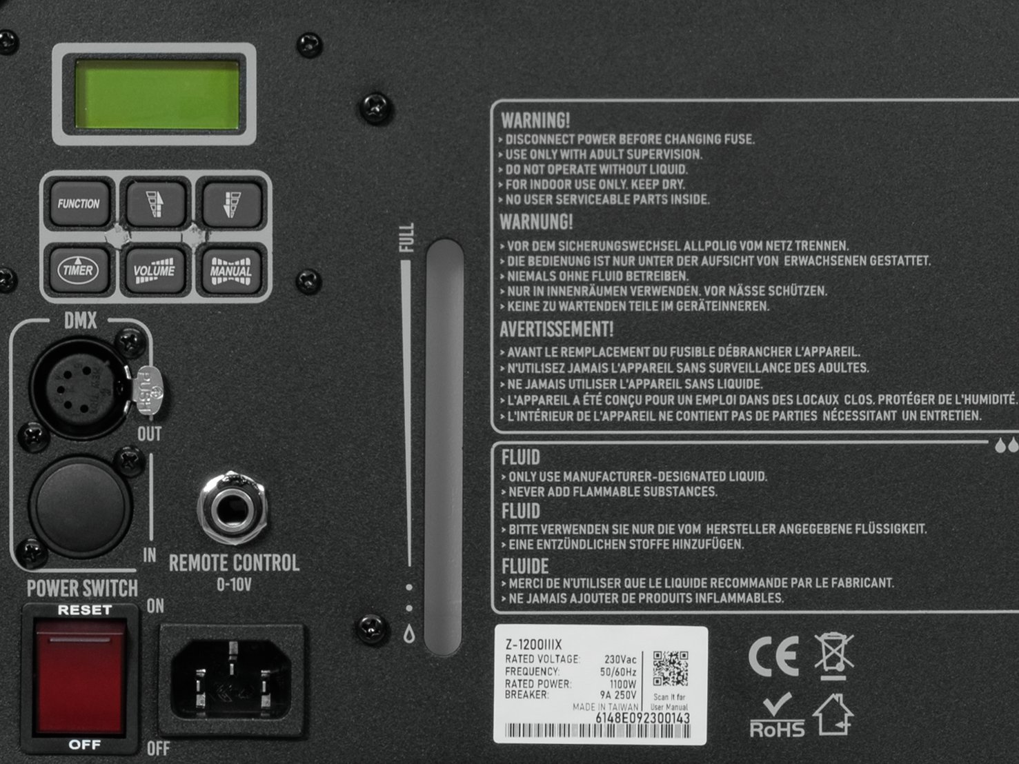 Home Smoke machines ANTARI Z-1200X MK3 ANTARI Z-1200X MK3 SKU: 51702638 635,86 € Desconto de %. IVA incluído. Comprar Contactar Adicionar à wishlist 1200 watt fogger with DMX/RDM, timer and optional wireless remote Improved version with about 10% more output volume than predecessor model Rugged metal housing with handle, mounting bracket and safety eyelet Heating element with Unicore technology Auto temperature control Continuous output Adjustable timer with interval, duration and output volume, continuous output, manual activation LCD display Control via DMX; RDM; stand-alone; Wireless remote control (optional); wired remote control (optional) With level indication Operates on water-based fluid Removable tank For application areas such as: Clubs/dancing school; Stage; theater; Rental Application possibility: Standing; suspended Package contents 1 x device, 1 x user manual, 1 x power cord, 1 x mounting bracket Power supply: 230 V AC, 50 Hz Power consumption: 1200 W IP classification: IP20 Power connection: Fixed power supply cord with safety plug Warm-up time: Approx. 10 min Tank capacity: 2,5 l water-based fluid removable tank Fluid consumption: Approx. 85 ml/min DMX channels: 1 DMX input: 1 x 5-pin XLR (M) mounting version DMX output: 1 x 5-pin XLR (F) mounting version Control: DMX; RDM; stand-alone; Wireless remote control (optional); wired remote control (optional) Housing color: Silver Display type: LCD display Dimensions: Length: 45,8 cmWidth: 24,3 cmHeight: 25,1 cm Weight: 10,80 kg Noise classification: Class 3 (clearly perceptible sounds) Marca ANTARI Tags ANTARIZ-1200XMK3 Características Partilhar