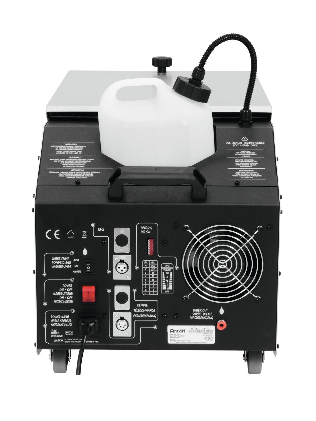 Home Smoke machines ANTARI ICE-101 Low Fog Machine ANTARI ICE-101 Low Fog Machine SKU: 51702664 1.096,37 € Desconto de %. IVA incluído. Comprar Contactar Adicionar à wishlist Floor fog machine with remote control or DMX, ice cube coolingStand-alone fogger with 8 kg capacity ice chamberCreates a heavy ground fog by means of fluid and crushed iceOperation with dry ice possibleContinuous outputRugged metal housingDrainage pump for melted waterAdjustable timer with interval, duration and output volume, continuous output, manual activationShort warm-up timeOutput distance: Approx. 6 mControl via DMX; wired remote controlOperates on water-based fluidRemovable tankFor application areas such as: Video and photography; Wedding/gala/events; theaterApplication possibility: StandingPackage contents1 x device, 1 x user manual, 1 x power cord, 1 x remote control, 1 x container, 1 x tube, 1 x filterPower supply:230 V AC, 50 HzPower consumption:1050 WIP classification:IP20Power connection:Mains input via IEC connector (M) mounting version power supply cord with safety plug (provided)Warm-up time:Approx. 4,5 minOutput volume:Approx. 283 m³/minOutput distance:Approx. 6 mTank capacity:2,5 l water-based fluid removable tankFluid consumption:Approx. 25 ml/minDMX channels:1DMX input:1 x 3-pin XLR (M) mounting versionDMX output:1 x 3-pin XLR (F) mounting versionControl:DMX; wired remote controlHousing color:SilverColor:SilverDimensions:Width: 36 cmDepth: 54 cmHeight: 51 cmWeight:24,40 kg Marca ANTARI Tags ANTARIICE-101LowFogmachineMáquinadenevoeirobaixa Características Partilhar