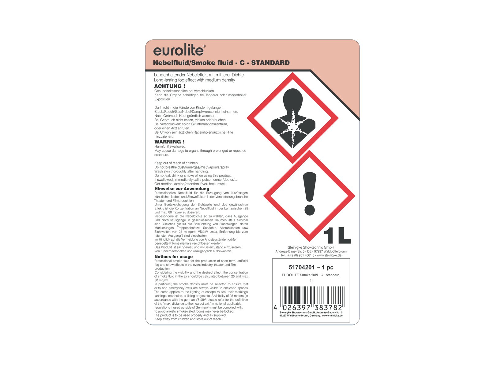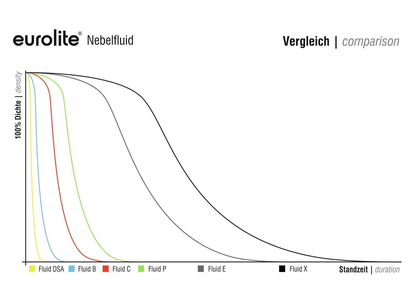 Eurolite smoke fluid - Made in GermanyTrust is good, control is of course better - therefore we test our smoke fluids according to valid norms to meet the legal requirements, for example the REACH act. There have to be reasons why a product has enjoyed public confidence for more than two decades. There have to be reasons why in 20 years we have sold more than a million units of smoke fluid.Quality and reliability are the decisive components for success. Our customers know they get an absolute high class product with Eurolite fluids. To be high class, a product has to do more than just function - it must guarantee not to be harmful to health. This may sound a bit too dramatic, but the truth is: unclean liquids can gravely affect the respiratory system. Moreover, easily inflammable liquids can cause serious damages. Many providers do not care about these dangers. At Steinigke however, we test our fluids stringently. And in addition, we let independent bodies continuously check the liquids.Therefore we can guarantee that our fluids are -water-based-odorless-Glycerine-free-non-toxic-not harmful to health-readily biodegradable-non-inflammable.Everyone using our smoke fluids places his trust in us. We pay it back with rigid controls of these liquids and both sides win.