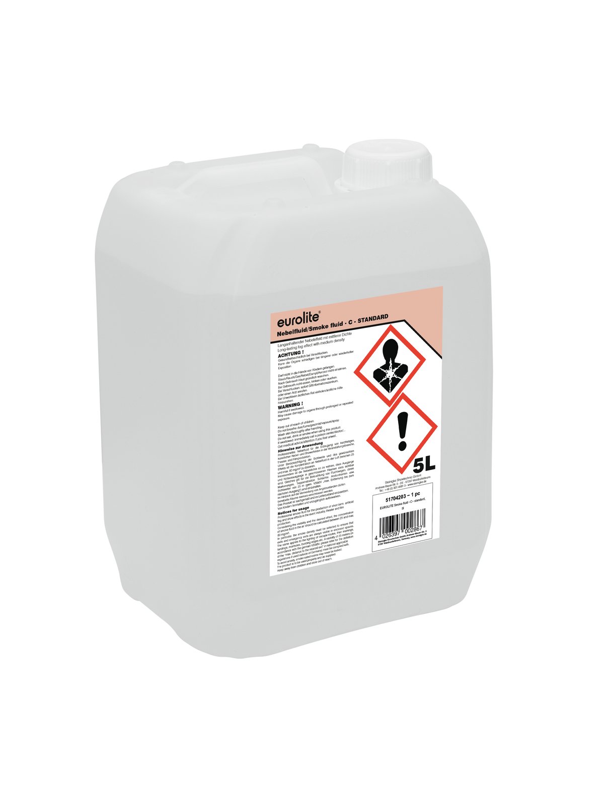 Eurolite smoke fluid - Made in GermanyTrust is good, control is of course better - therefore we test our smoke fluids according to valid norms to meet the legal requirements, for example the REACH act. There have to be reasons why a product has enjoyed public confidence for more than two decades. There have to be reasons why in 20 years we have sold more than a million units of smoke fluid.Quality and reliability are the decisive components for success. Our customers know they get an absolute high class product with Eurolite fluids. To be high class, a product has to do more than just function - it must guarantee not to be harmful to health. This may sound a bit too dramatic, but the truth is: unclean liquids can gravely affect the respiratory system. Moreover, easily inflammable liquids can cause serious damages. Many providers do not care about these dangers. At Steinigke however, we test our fluids stringently. And in addition, we let independent bodies continuously check the liquids.Therefore we can guarantee that our fluids are -water-based-odorless-Glycerine-free-non-toxic-not harmful to health-readily biodegradable-non-inflammable.Everyone using our smoke fluids places his trust in us. We pay it back with rigid controls of these liquids and both sides win.