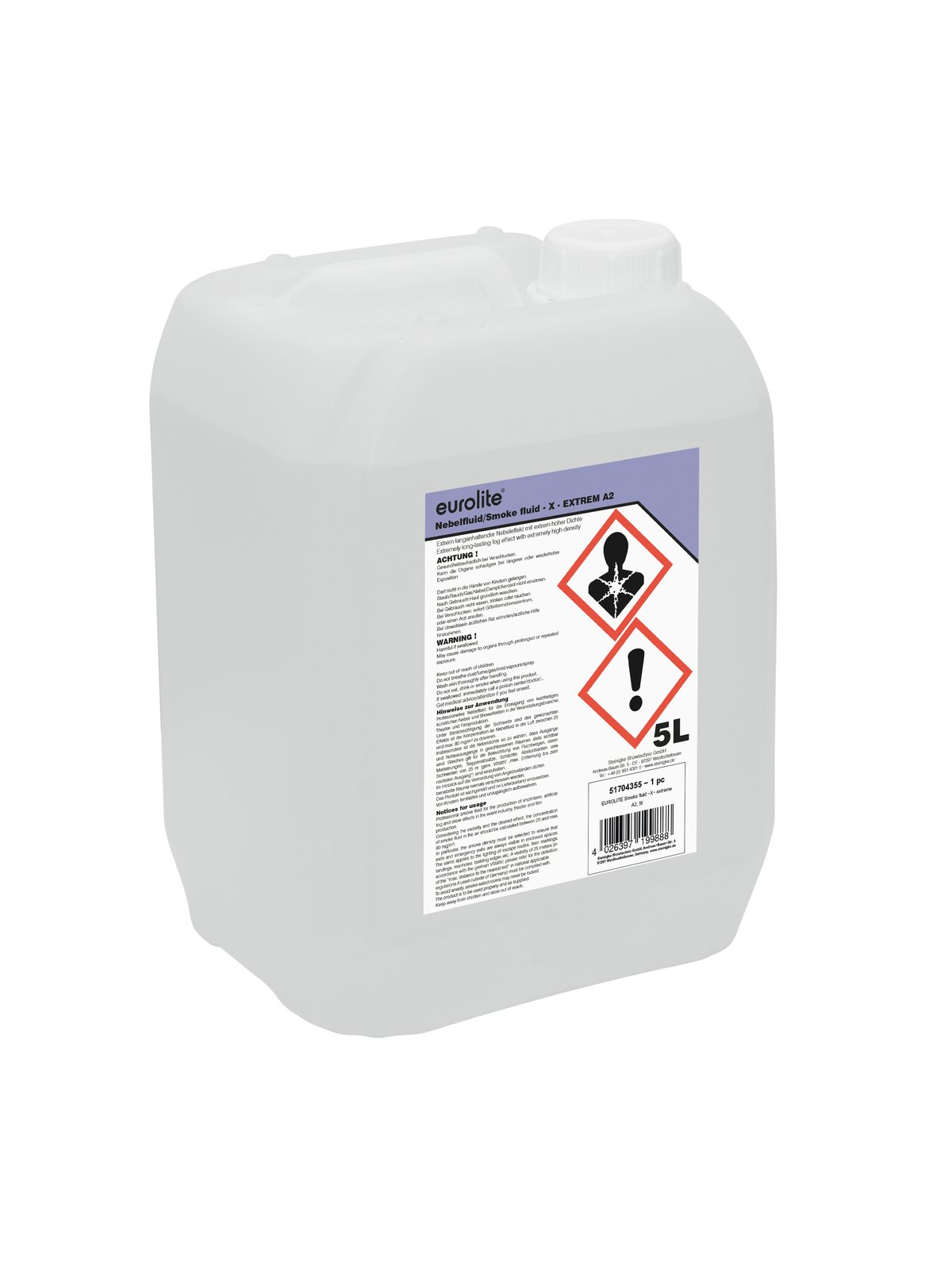 Eurolite smoke fluid - Made in GermanyTrust is good, control is of course better - therefore we test our smoke fluids according to valid norms to meet the legal requirements, for example the REACH act. There have to be reasons why a product has enjoyed public confidence for more than two decades. There have to be reasons why in 20 years we have sold more than a million units of smoke fluid.Quality and reliability are the decisive components for success. Our customers know they get an absolute high class product with Eurolite fluids. To be high class, a product has to do more than just function - it must guarantee not to be harmful to health. This may sound a bit too dramatic, but the truth is: unclean liquids can gravely affect the respiratory system. Moreover, easily inflammable liquids can cause serious damages. Many providers do not care about these dangers. At Steinigke however, we test our fluids stringently. And in addition, we let independent bodies continuously check the liquids.Therefore we can guarantee that our fluids are -water-based-odorless-Glycerine-free-non-toxic-not harmful to health-readily biodegradable-non-inflammable.Everyone using our smoke fluids places his trust in us. We pay it back with rigid controls of these liquids and both sides win.