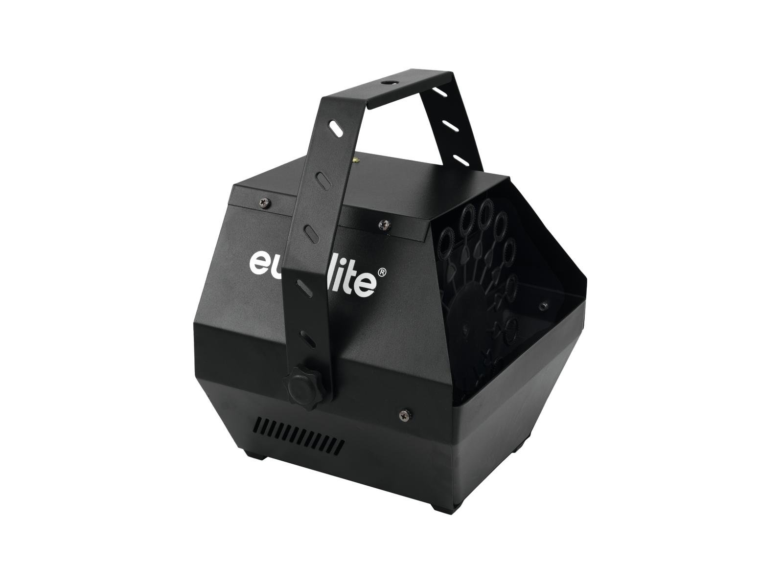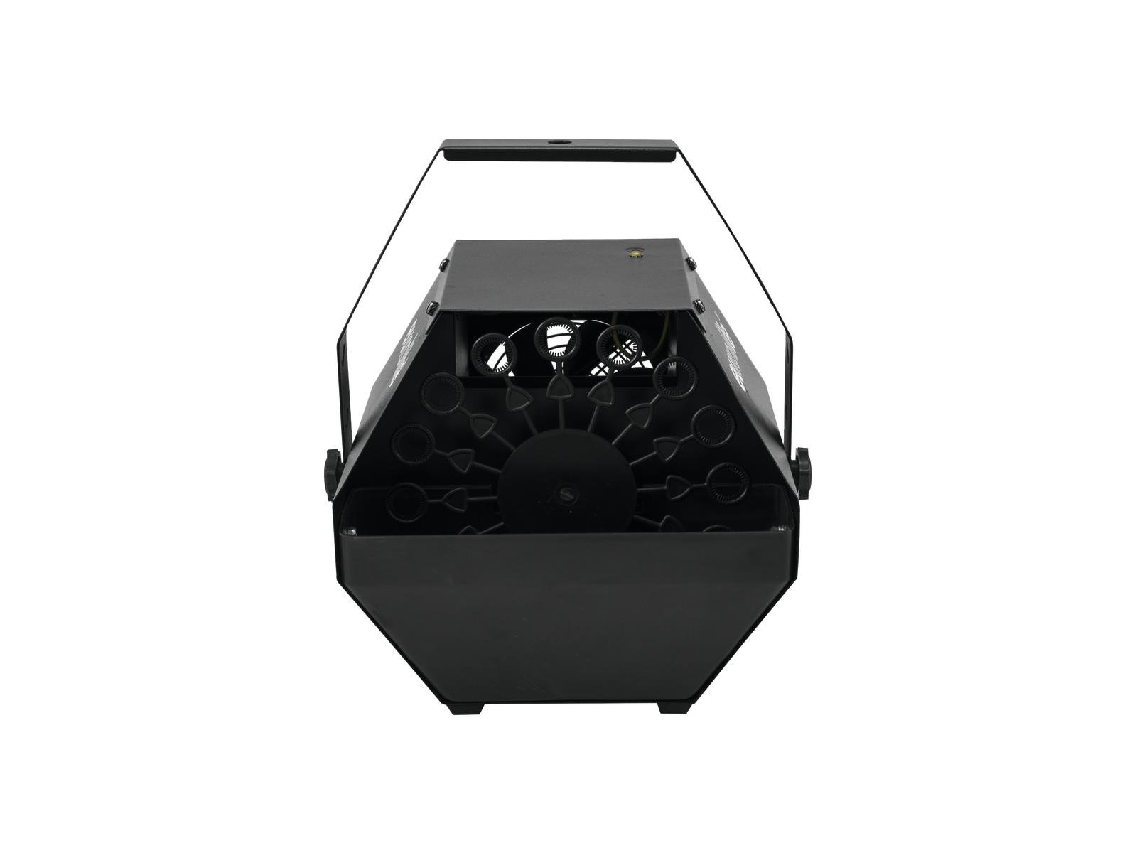 Bubble machine for hanging or standing installationThe Eurolite B-90 bubble machine is ideal for fashion shows, for use in discotheques or for your carnival event.A rotating ring wheel picks up the soapy water and the fan circulates the soap bubbles around the room. Refilling the soapy water is absolutely easy and fluid usage is low.The Eurolite B-90 can be installed hanging or standing as needed. It can be conveniently controlled via the on/off switch directly on the device.