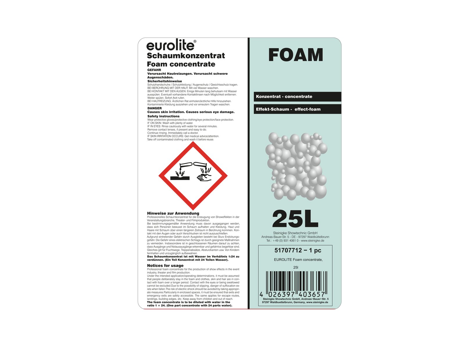 Home Foam fluid - liquido de espuma EUROLITE Foam Concentrate, 25l EUROLITE Foam Concentrate, 25l SKU: 51707712 317,04 € Desconto de %. IVA incluído. Comprar Contactar Adicionar à wishlist Foam concentrate for all machinesWithout additives25 liter container1 part of concentrate must be diluted with 24 parts of waterFor 625 liters of high-quality foam fluidFoam fluid ConcentrateMade in GermanyContainer size:25 lType of fluid:Foam fluid ConcentrateWeight:26 kg Marca Eurolite Tags EUROLITEfoamconcentrate25lConcentradodeEspuma Partilhar