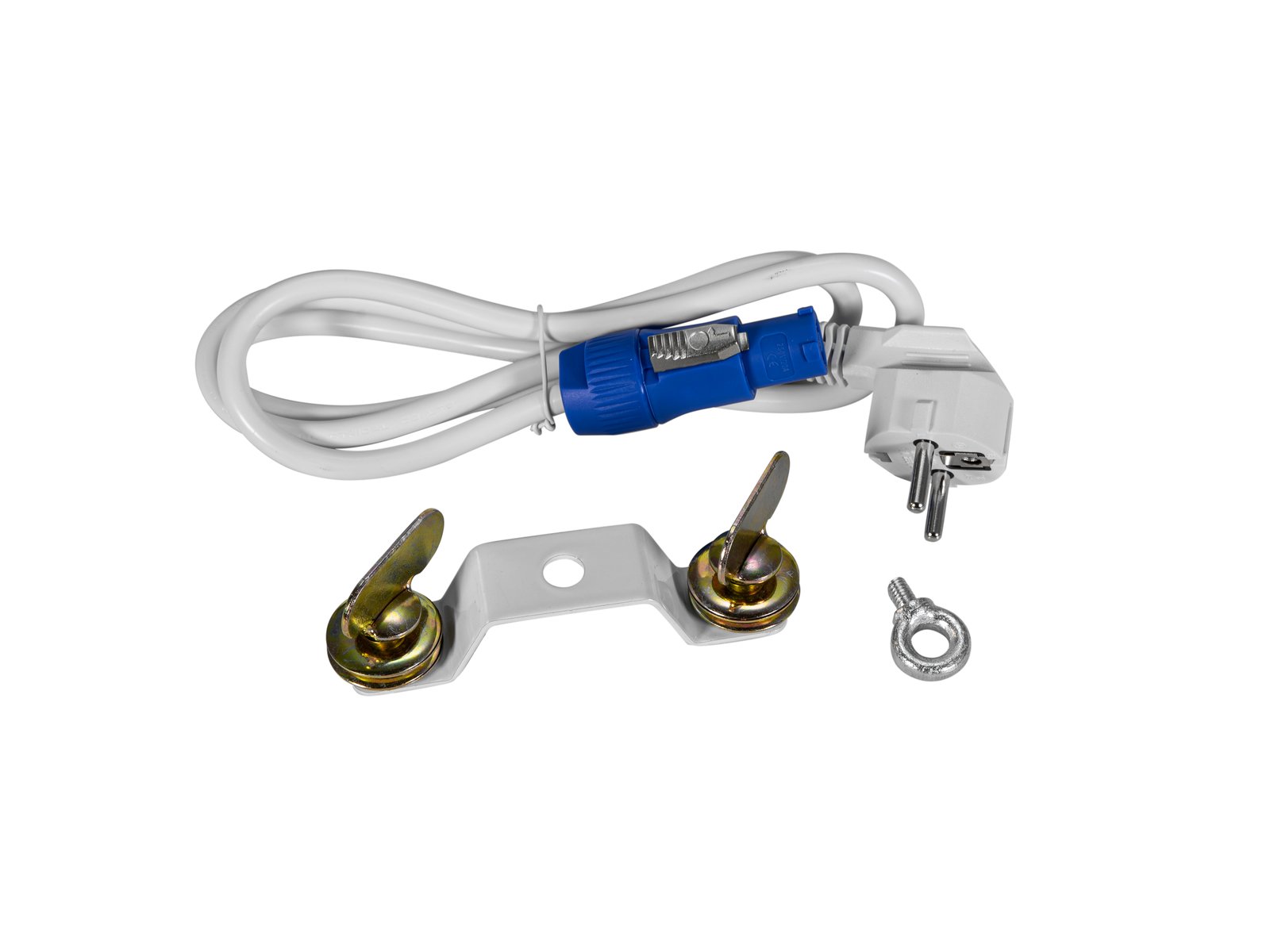 - 1 x moving light, 1 x user manual, 1 x power cord, 1 x omega bracket, 1 x safety eyelet, 3 x gobos