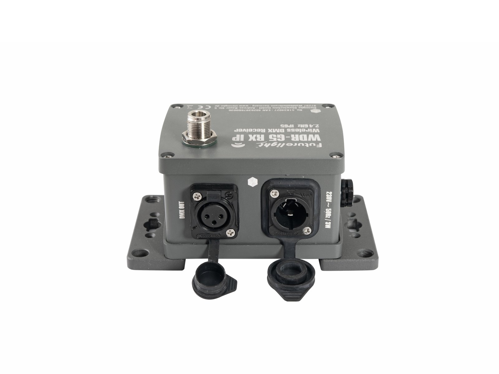 Weather-proof wireless DMX receiver by Wireless Solution, IP65With the weatherproof DMX radio receiver of FUTURELIGHT WDR-G5 you have a wireless receiver for 512 DMX channels, which allows you to operate almost all your devices wirelessly with DMX control. Thanks to the G5 receiver unit incl. antenna from Wireless Solutions you are able to bridge longer distances and leave out annoying cables.The WDR-G5 is very suitable for use on larger stages or events.The integrated AFHSS technology ensures interference-free signal transmission in the 2.4 GHz band, which is free of registration and fees worldwide.The weatherproof die-cast aluminium housing (IP65) is equipped with mounting strips. Thanks to the lockable input socket for mains connection, which withstands almost any weather when closed, the WDR-G5 can also be used for open-air festivals. The range of the DMX radio receiver is 500 m with visual contact. A simple and quick start-up with only one button is possible thanks to Plug & Play. The integrated LED allows you to easily monitor the operating status.