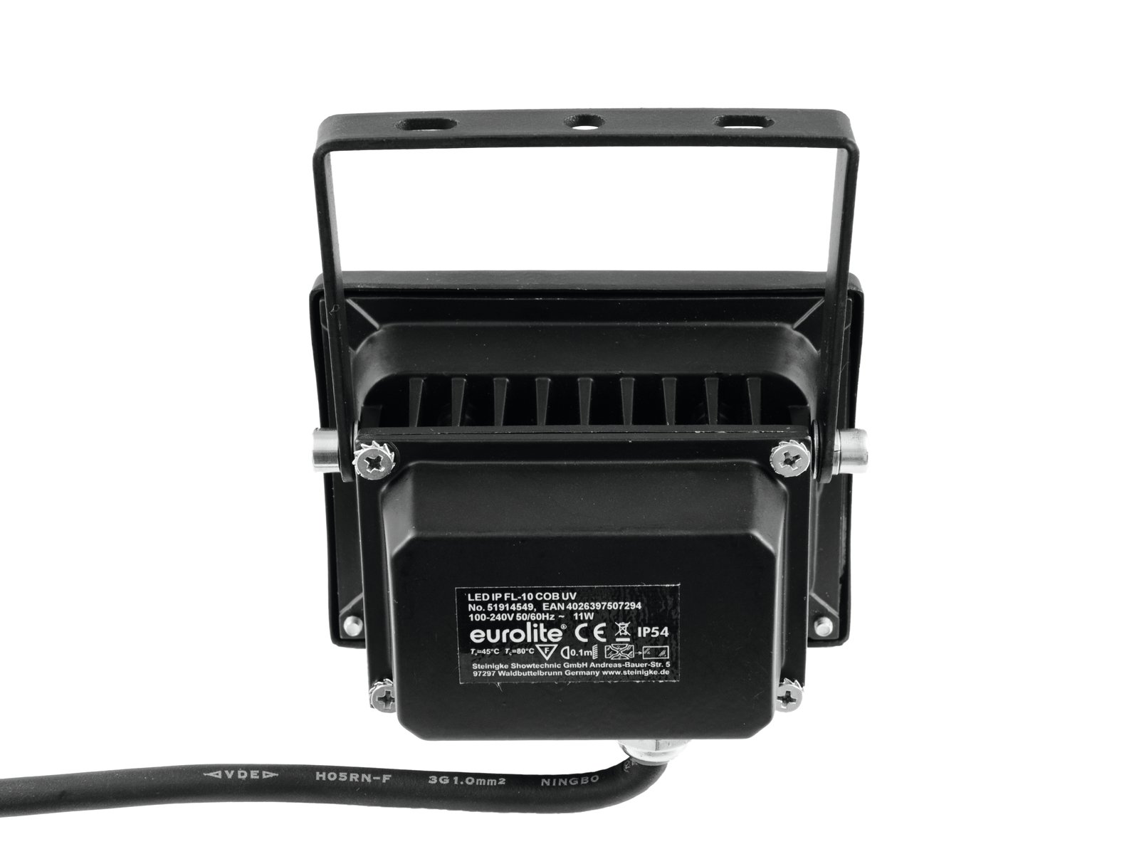 Home Led Par - Floodlights EUROLITE LED IP FL-10 COB UV EUROLITE LED IP FL-10 COB UV SKU: 51914549 58,27 € Desconto de %. IVA incluído. Comprar Contactar Adicionar à wishlist Weather-proof (IP54) UV spotlight with 10 W COB UV LEDSuitable for larger distances1 powerful LED 10 W COB (chip-on-board) ultra violet (UV)UV effectThe device is cooled by passive convection coolingControl via plug and playWith a beam angle of 120°With Mounting bracketSuitable for outdoor use IP54Silent operationFor application areas such as: Restaurants, bars and hotels; small rental; architecture; InstallationApplication possibility: SuspendedPackage contents1 x spotlight, 1 x user manualPower supply:100-240 V AC, 50/60 HzPower consumption:11 WIP classification:IP54Protection class:Protection class IPower connection:Fixed power supply cord with safety plugCable construction:3 x 1,0 mm² H05RN-FCable length:Approx. 1,7 mLamp type:LED lampLED:1 x 10 W COB (chip-on-board) ultra violet (UV)Cooling:Passive convection coolingControl:Plug and playBeam angle:120°Beam angle (1/2 peak):120°Wavelength:Ultra violet (UV) 396 nmHousing color:BlackAttachment system:Mounting bracketMaterial:Aluminum castingDimensions:Width: 11,3 cmDepth: 8 cmHeight: 13 cmWeight:560 gNoise classification:Class 0 (no noise at all)Mounting bracketDiameter mounting holes:1 x Ø7mm; 2 x Ø6mmMaterial:Metal, 1,5 mmLegal specificationsSpecial product:Not designed for household room illuminationIntended use:Show effect lighting Marca Eurolite Tags EUROLITELEDIPFL-10COBUV Características Partilhar