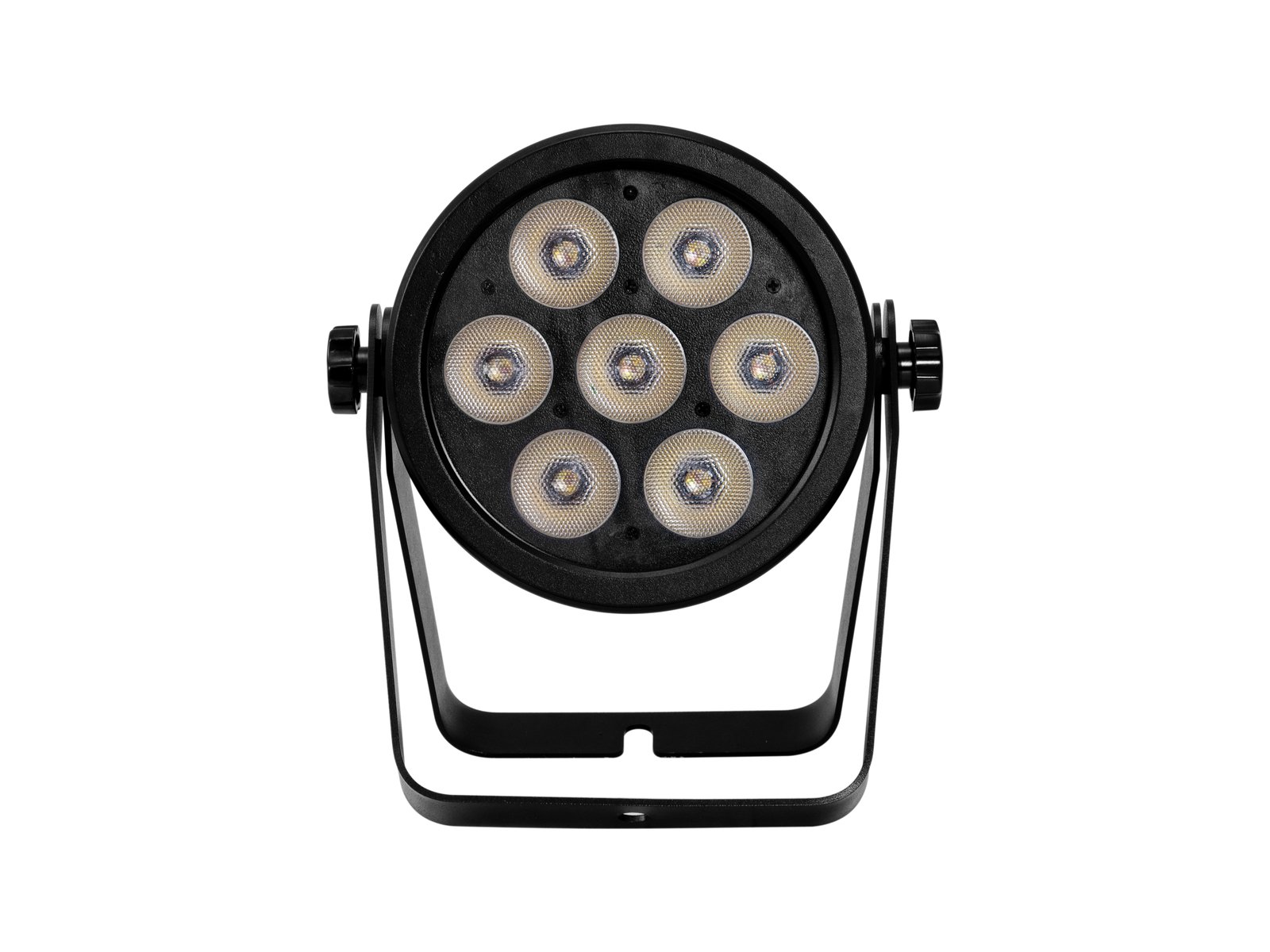 Seven colors in one LEDWith this LED spotlight, the name 7C stands for unlimited possibilities for colour design: you have 7 colours available for colour mixing. In addition to red, green and blue, this includes amber, cold white, warm white and UV. No matter which color you want to create, this spotlight leaves nothing to be desired. Even white light can be created with an excellent CRI in any desired color temperature thanks to the color mixing. The headlamps are available in two versions: With 7 or 12 nine watt strong LEDs.Fanless and quietBut both models have even more advantages: Don't worry about annoying noises - the headlamps do not need a fan. The compact metal housing is very sturdy. The power is connected via a P-Con input and you can also loop the power through to other devices. A USB socket is available for wireless transmission of the DMX signal, into which a wireless Quick DMX receiver can be plugged directly.