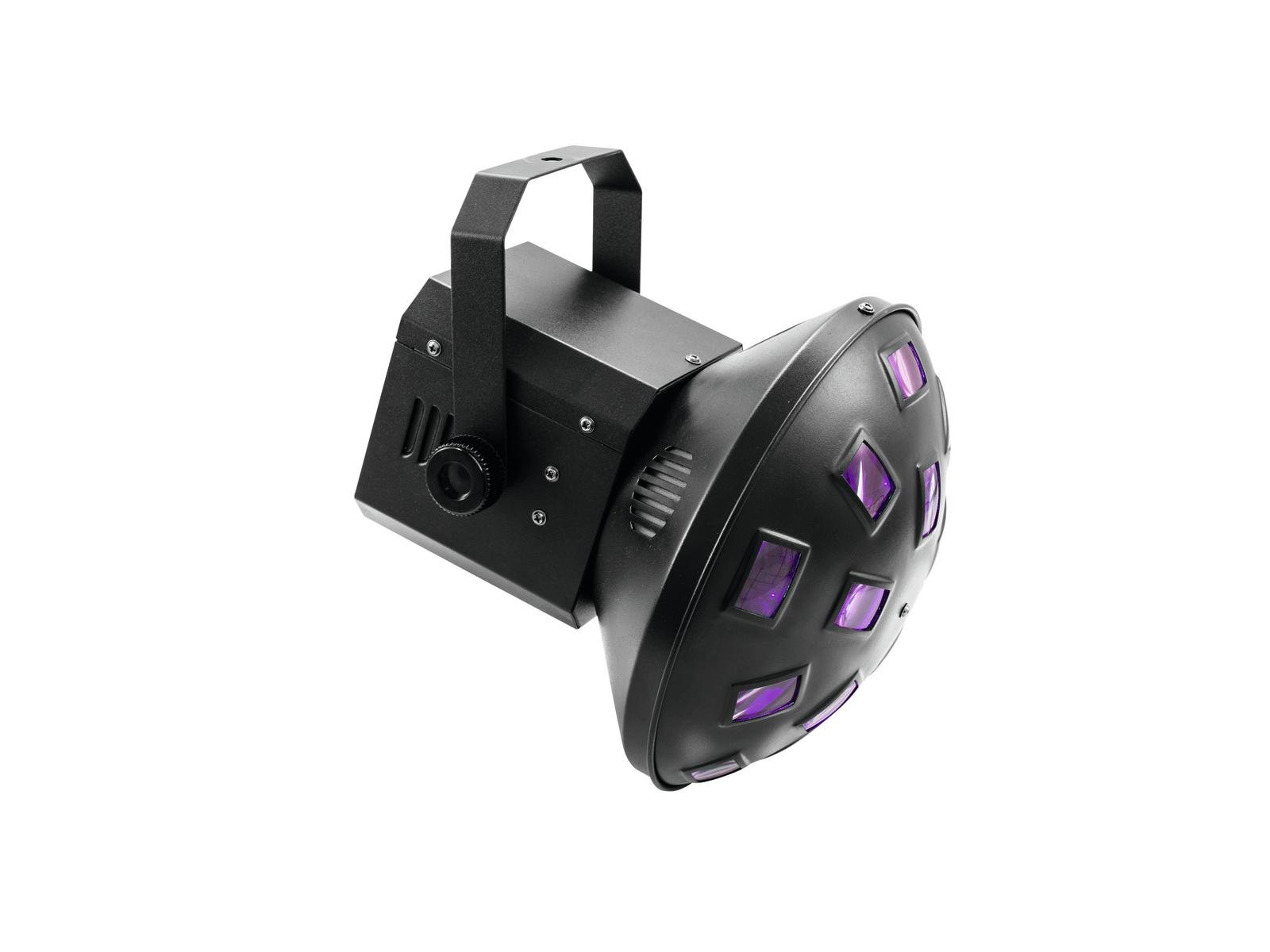 5 colors plus blacklightThe LED Z-20 by Eurolite is a classic mushroom beam effect with six different 3-watt LEDs that produce mesmerizing light shows in the colors red, green, blue, amber, white, and including UV light.Various control optionsThe device works with preset programs which can be played either fully automatically in automatic mode or sound-controlled via the integrated microphone. The emanating beams then move in circles and change their direction with each bass beat. Changing color patterns, strobe effects and the adjustable running speed and microphone sensitivity complete the package. Everywhere in useOf course, the LED Z-20 is delivered ready to use with plug and power cord. With a low power consumption of 16 watts and only 2 kg weight, the LED Z-20 is an exciting, inexpensive beam effect for mobile DJs, clubs, bars and party rooms of any kind.
