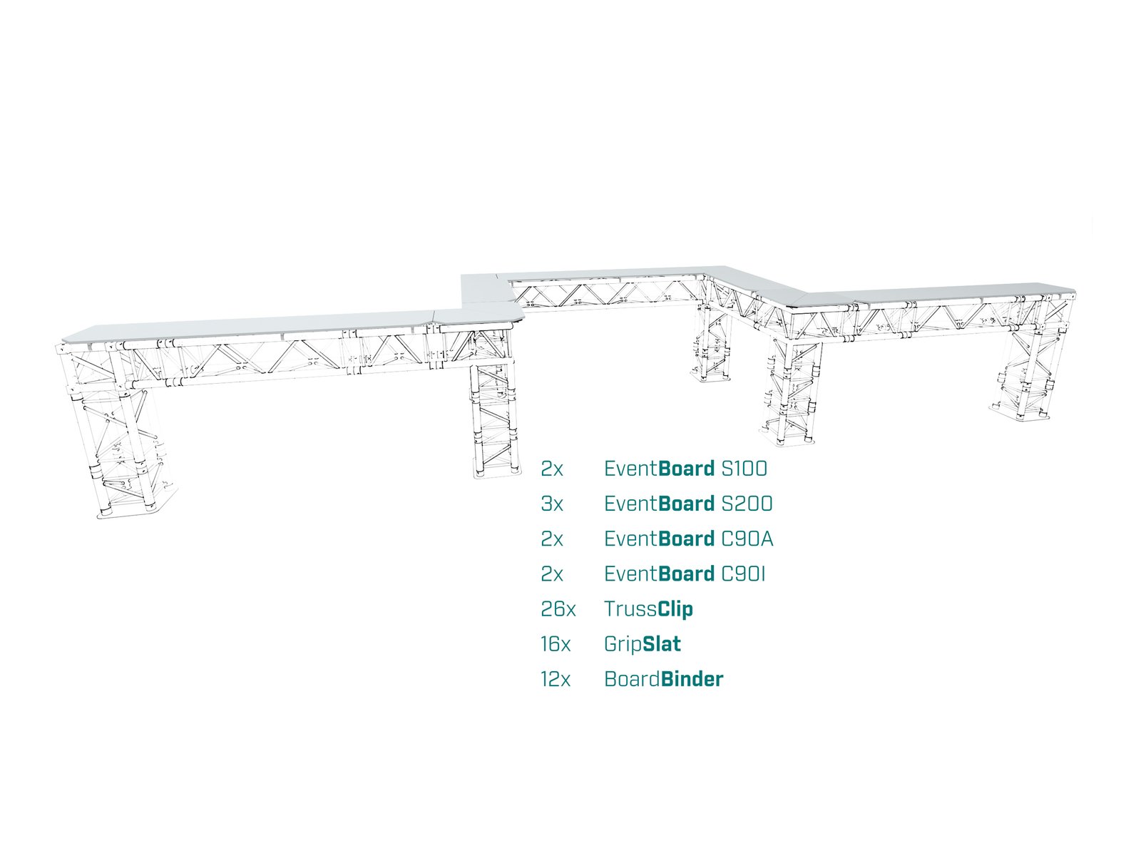 Home Truss acessory OnTruss EventBoard C90I PREMIUM grey OnTruss EventBoard C90I PREMIUM grey SKU: 60303165 322,36 € Desconto de %. IVA incluído. Comprar Contactar Adicionar à wishlist OnTruss EventBoard. One system. Many possibilities.EventBoard fits all 2-point, 3-point and 4-point trusses. It is compatible with all common manufacturers.EventBoard supports every bracing. The course of the cross bracing does not matter.EventBoard works on trusses with and without end plates.One system for different applications (counter, table, seating furniture, panelling)Low transport and storage volumeFlexibly expandableFree design (with only a few panel types)No protruding partsOnTruss TrussClips can be mounted without tools via 90° turnMarking system for quick mounting of the TrussClipsHigh durabilityDesign flexibility for the truss subbase (e.g. easy mounting of EventBoard S100 on truss divisions of 50cm + 29cm + 21cm)Additional rail for extensions available (e.g. FrontCover)EventBoard Premium in corner version90° inner corner suitable for 90° truss corners (can also be used for box corners)Folding mechanism for space-saving storageSurface / Edges: PVC / ABSSuitable for pipe distance: 239mm ... 240mmEasy to assembleSuitable for outdoor useMade in GermanySetup:Easy to assembleColor:GreyDimensions:Length: 58 cmWidth: 58 cmHeight: 1,50 cm Marca OnTruss Tags OnTrussEventBoardC90IPREMIUMgreygray Características Partilhar