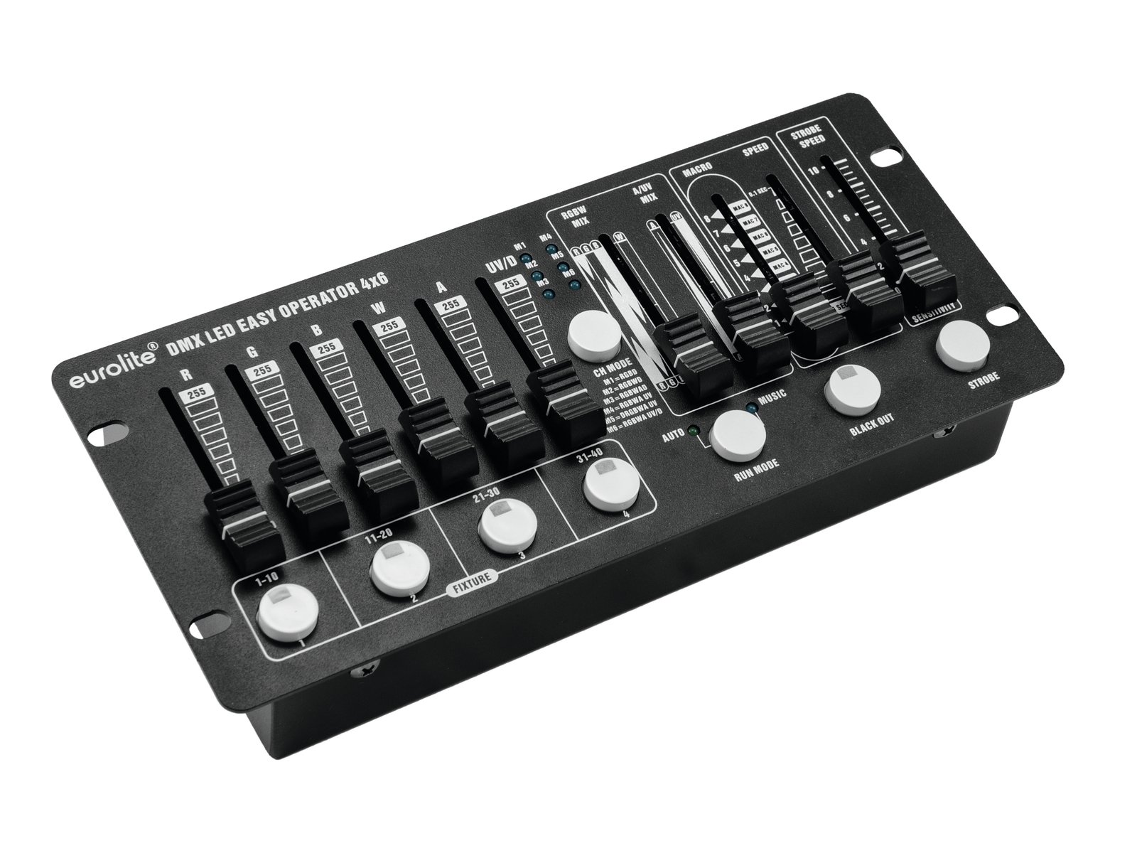 Home DMX Controllers EUROLITE DMX LED EASY Operator 4x6 EUROLITE DMX LED EASY Operator 4x6 SKU: 70064570 81,48 € Desconto de %. IVA incluído. Comprar Contactar Adicionar à wishlist Compact DMX controller for 4 LED spotlights with up to 6 colors eachDMX controller for standard LED spotlightsEasy handling4 fixtures with RGBAW+UV LEDs can be controlled individually or in combinationDMX channels for red, green, blue, amber, white, UV and masterVarious modes for the DMX channel sequence selectableManual control via 6 faders2 faders for direct RGBW and A/UV mixingAdjustable strobe functionBlackout function8 integrated show programsCan transmit up to 28 DMX channelsControl via DMX; Sound to light via Microphone; stand-aloneDesktop console housingFor application areas such as: Party room; mobile djs/entertainer; restaurants, bars and hotelsSilent operationPackage contents1 x controller, 1 x user manual, 1 x external mains adapterPower supply:100-240 V AC, 50/60 Hz9 V DC 800 mAPower consumption:10 WIP classification:IP20Power connection:Mains input via Coaxial power connector (M) mounting version power supply cord with AC adapter (provided)DMX channels:Output 28Control:DMX; Sound to light via Microphone; stand-aloneHousing color:BlackColor:BlackHousing design:Desktop console housingDimensions:Width: 25 cmDepth: 11,5 cmHeight: 5,5 cmWeight:1,04 kgNoise classification:Class 0 (no noise at all) Marca Eurolite Tags EUROLITEDMXLEDEasyOperator4x6operadorFácil Características Partilhar
