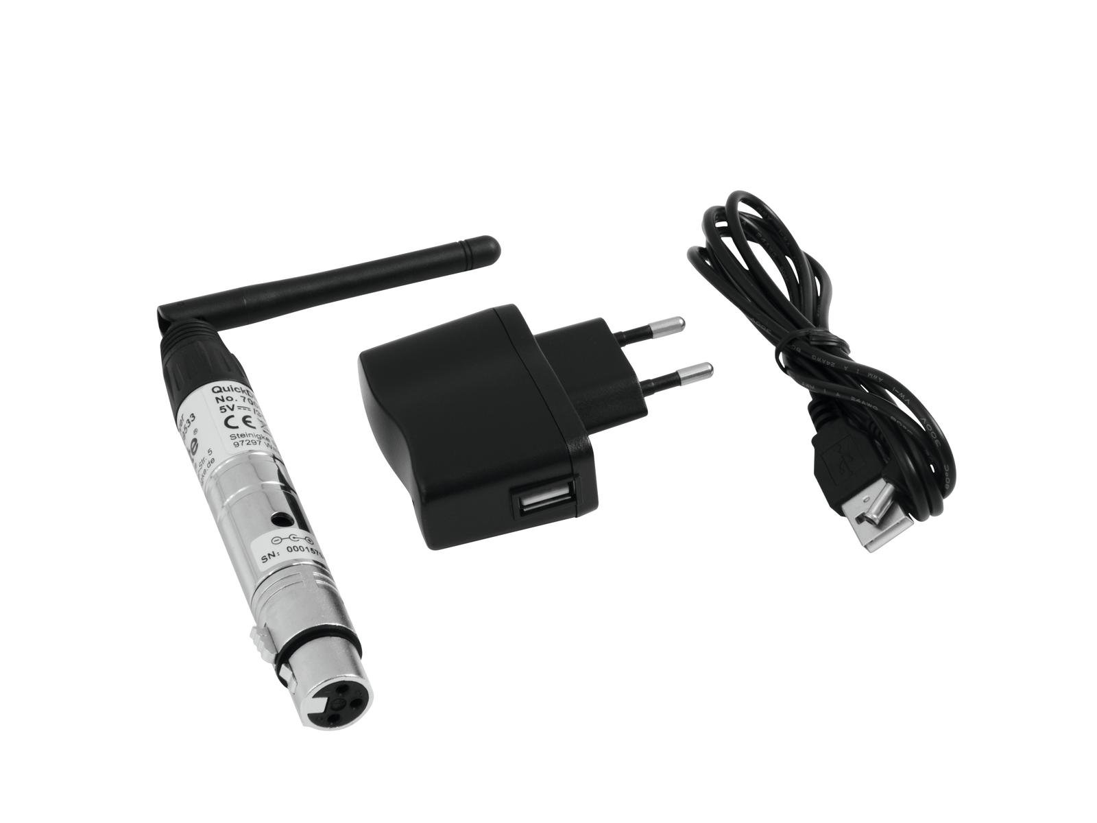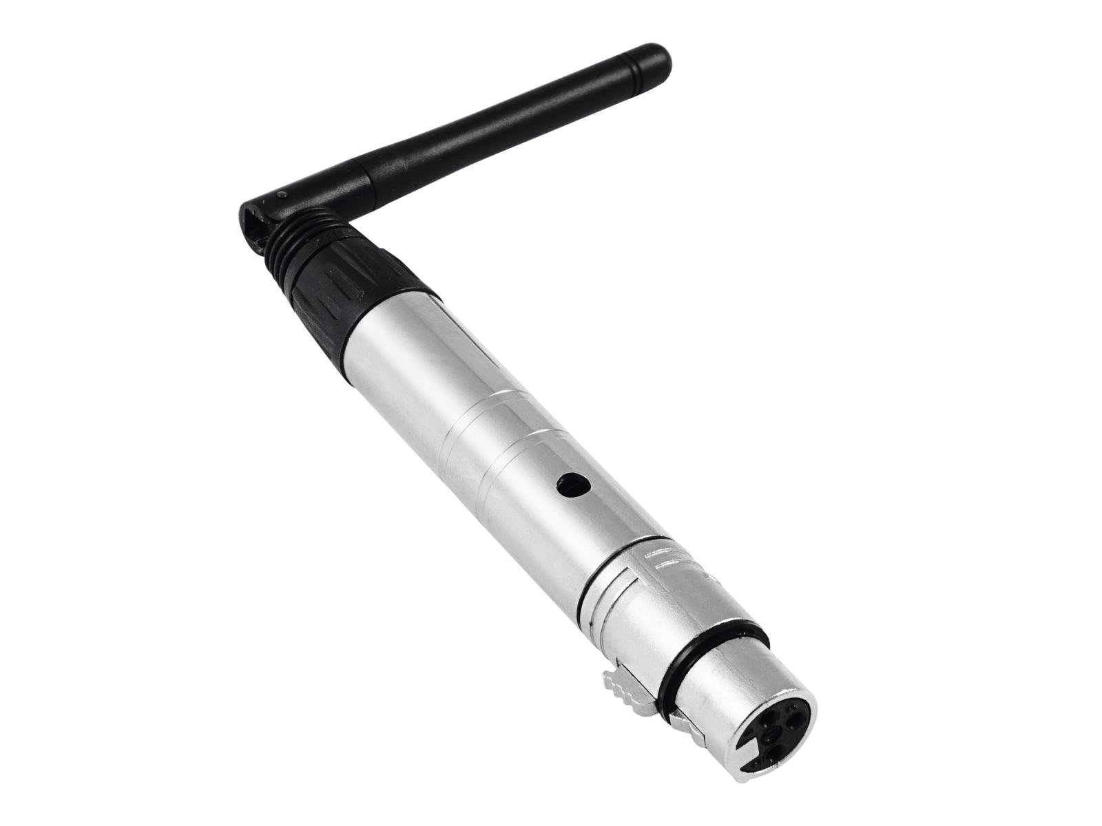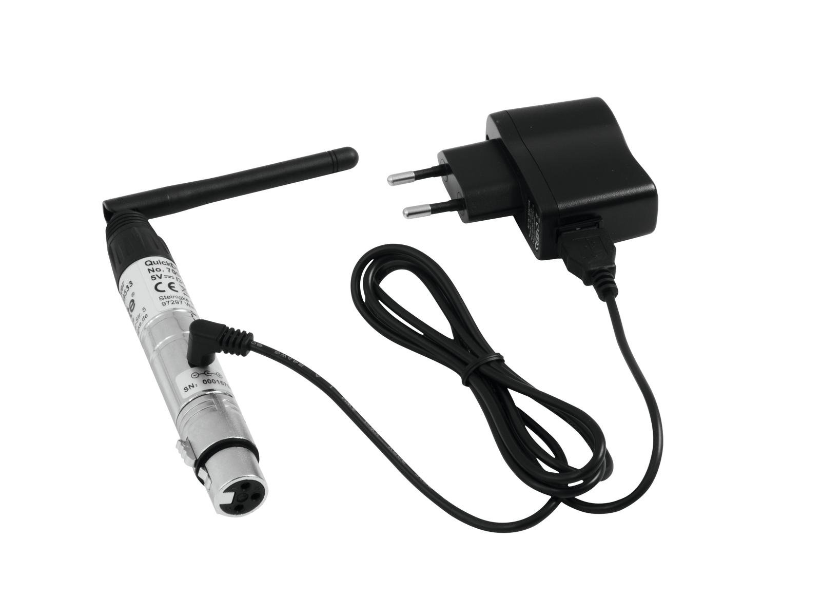 Compact DMX Wireless System 2.4 GHzThe Eurolite QuickDMX transmitter and receiver is used for wireless transmission of DMX512 signals. The complete technology is integrated in an extended 3-pole XLR connector (female) with a rotatable antenna. The device is constructed as a transceiver, so it can be used as any transmitter and receiver. The use of this device eliminates the necessity of time-consuming cabling between the DMX lighting control unit and the DMX-controlled devices.Due to the GFSK technology (Gaussian Frequency Shift Keying), interference-free operation is also possible besides other wireless Bluetooth and WiFi devices.The range is up to 400 meters with visual contact.Setup is very easy via Plug & Play with a button for connecting and disconnecting QuickDMX receivers.