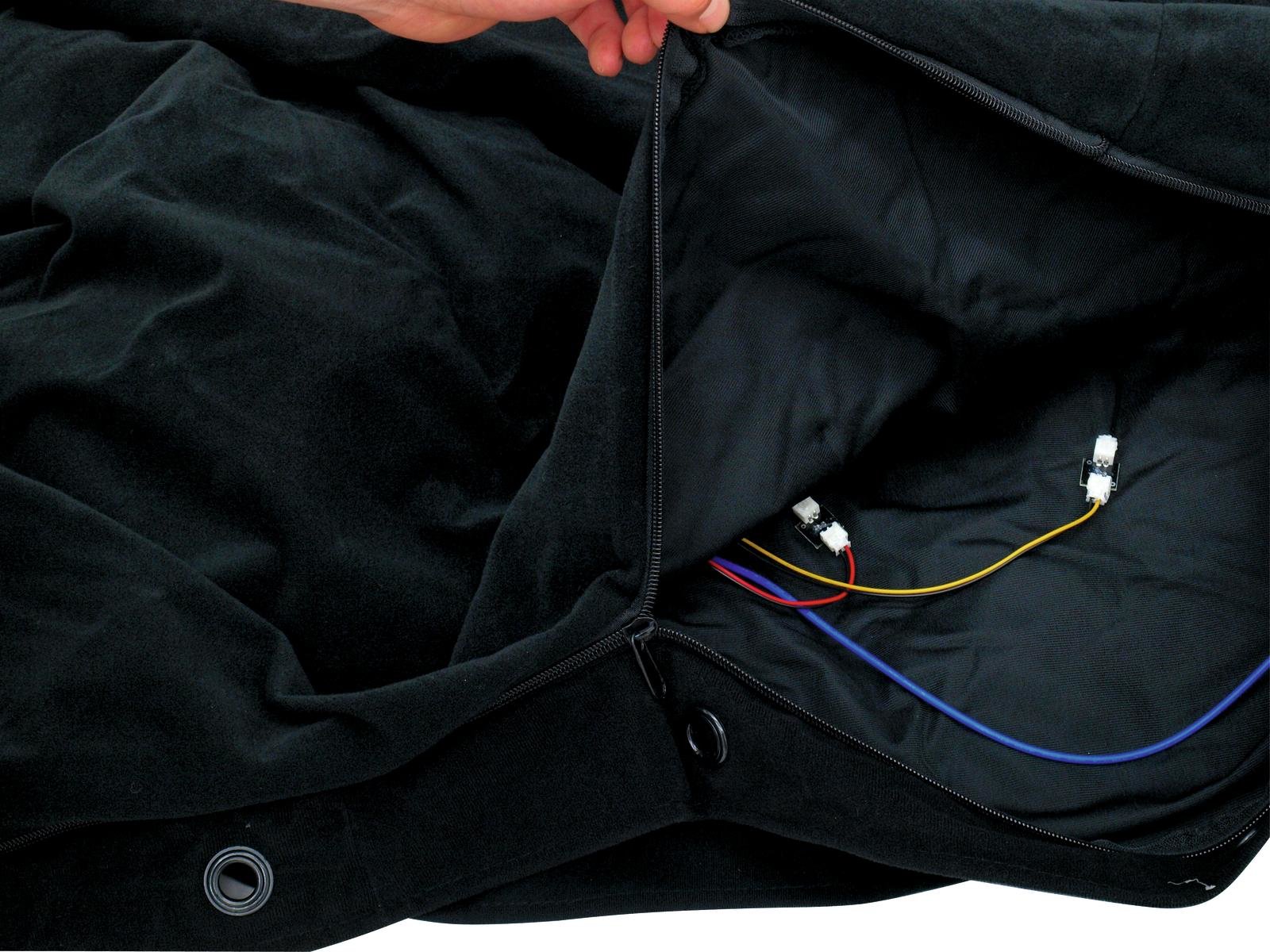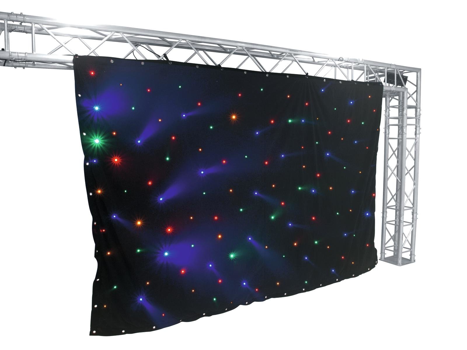 Home EFFECT CURTAINS EUROLITE CRT-120 LED-Curtain EUROLITE CRT-120 LED-Curtain SKU: 80503400 394,98 € Desconto de %. IVA incluído. Comprar Contactar Adicionar à wishlist LED curtain with 120 LEDs RGB+yellow and compatible DMX controller (3 x 2 m)Several curtains can be linked via DMX512120 powerful LEDs 5 mm R/G/B/AThe device is cooled by passive convection coolingControl via stand-alone; DMX; Sound to light via MicrophoneEasy installationB1 low flammabilityFor application areas such as: Party room; mobile djs/entertainerWater repellentDimmer electronic; color selection manual; color change adjustable; color fade adjustableStrobe effectPackage contents1 x controller, 1 x curtain, 1 x user manual, 1 x power cord, 58 x mounting material, 8 x illuminantPower supply:100-240 V AC, 50/60 HzPower consumption:15,00 WIP classification:IP20Power connection:Mains input via IEC connector (M) mounting version power supply cord with safety plug (provided)LED:120 x 5 mm R/G/B/AFlash rate:1 - 12 HzDMX channels:8DMX input:1 x 3-pin XLR (M) mounting versionDMX output:1 x 3-pin XLR (F) mounting versionCooling:Passive convection coolingControl:Stand-alone; DMX; Sound to light via MicrophoneSetup:Easy installationHousing color:BlackMaterial:, water repellentControllerDimensions:Width: 18 cmDepth: 19 cmHeight: 9 cmWeight:1,2 kgCurtainDimensions:Width: 3 mHeight: 2 mWeight:3,6 kgLegal specificationsSpecial product:Not designed for household room illuminationIntended use:Show effect lighting Marca Eurolite Tags EUROLITECRT-120LED-Curtain Características Partilhar