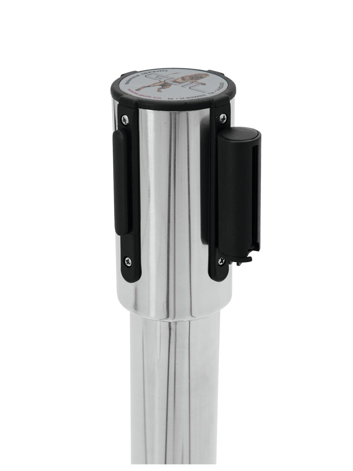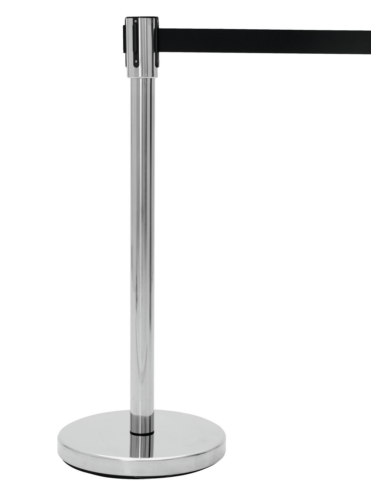 Barricade and direct: Time-saving and elegantThis barrier system enables you to create queues, manage people or close off an area. Whether discotheque, cinema or waiting room: thanks to its quick assembly and disassembly, you can use the system flexibly for the most diverse occasions. High-quality designThe posts of the barrier system are made of stainless steel and are therefore also suitable for outdoor use. The material is highly polished and looks very elegant. The belt system is self-retracting. A belt can be extended up to 3 meters. The belt pulleys are interchangeable and available in red and black.You can connect the end of the belt either with a permanently installed wall bracket or another belt system.