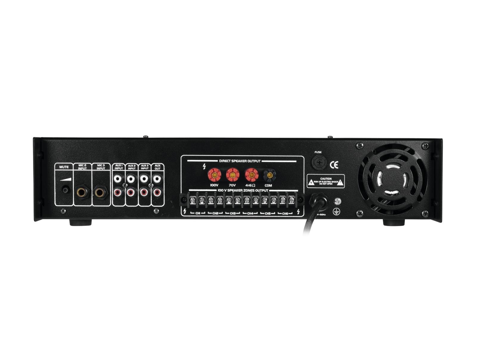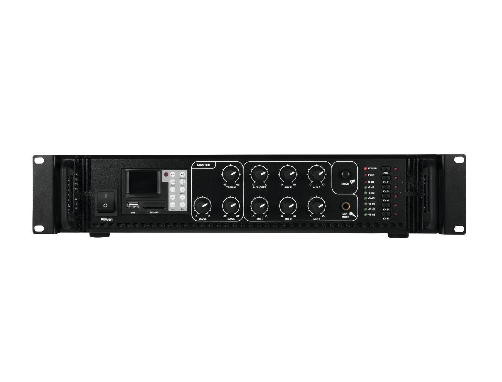Enormous reliability with a maximum of flexibility The Omnitronic MPZ-500.6P ELA mixer amplifier is your reliable partner for ELA sound reinforcement systems. Thanks to its 19" format, it is ideally suited for both mobile and permanent installations. Outputs for ELA loudspeakers with 70 V and 100 V audio transformers or 4-16- Ohm loudspeakers leave nothing to be desired. In addition, you can also connect a device with line level (e.g. mixing console) to the line output. With 6 mixable inputs you are always flexible. Connect up to 3 microphones and 3 line level devices. Control your ELA speakers conveniently via the 6 zone outputs of the MPZ-500.6P. They can be switched separately on the front panel. For you, this means the greatest possible adaptability when implementing your sound reinforcement concept.The MPZ-500.6P also offers you an MP3 player with infrared remote control and blue backlit LCD display. It has both an SD card slot and a USB port. So you can spontaneously and flexibly play music titles from a storage medium of your choice.Make yourself heard! The microphone input at the front has an adjustable priority switch. It allows you to make important announcements with automatic, continuously adjustable level reduction of all signals. You can also use the gong to draw attention to your announcement. Protective functionsA fan protects the interior of your MPZ-500.6P from overheating. In addition to a switch-on delay, it has protection circuits against overvoltage and short-circuits. In these cases, your loudspeakers are electrically isolated from the amplifier. This protects both the MPZ-500.6P and your speakers from damage.
