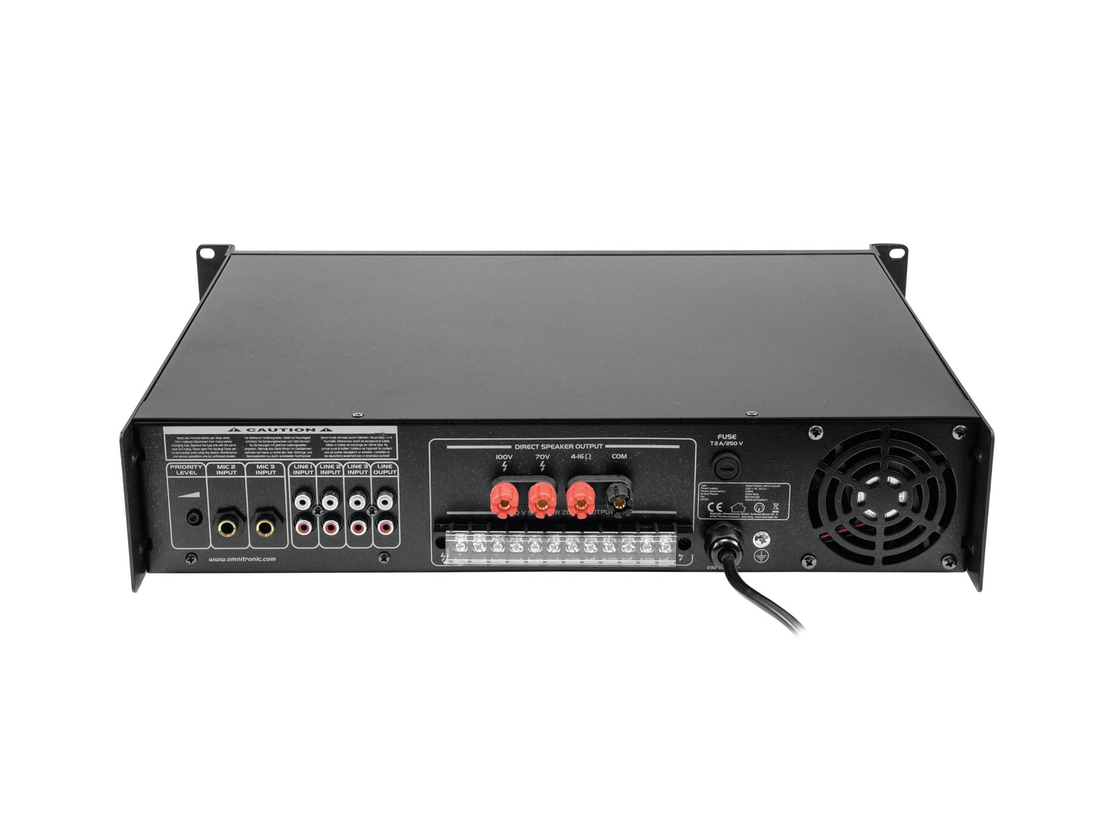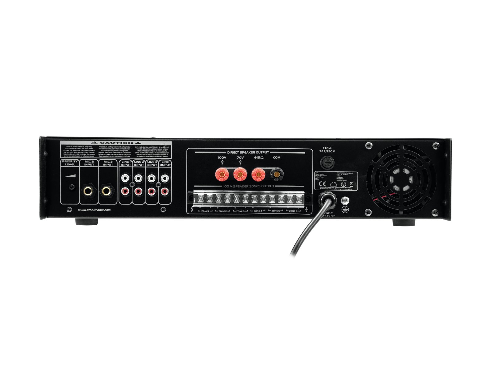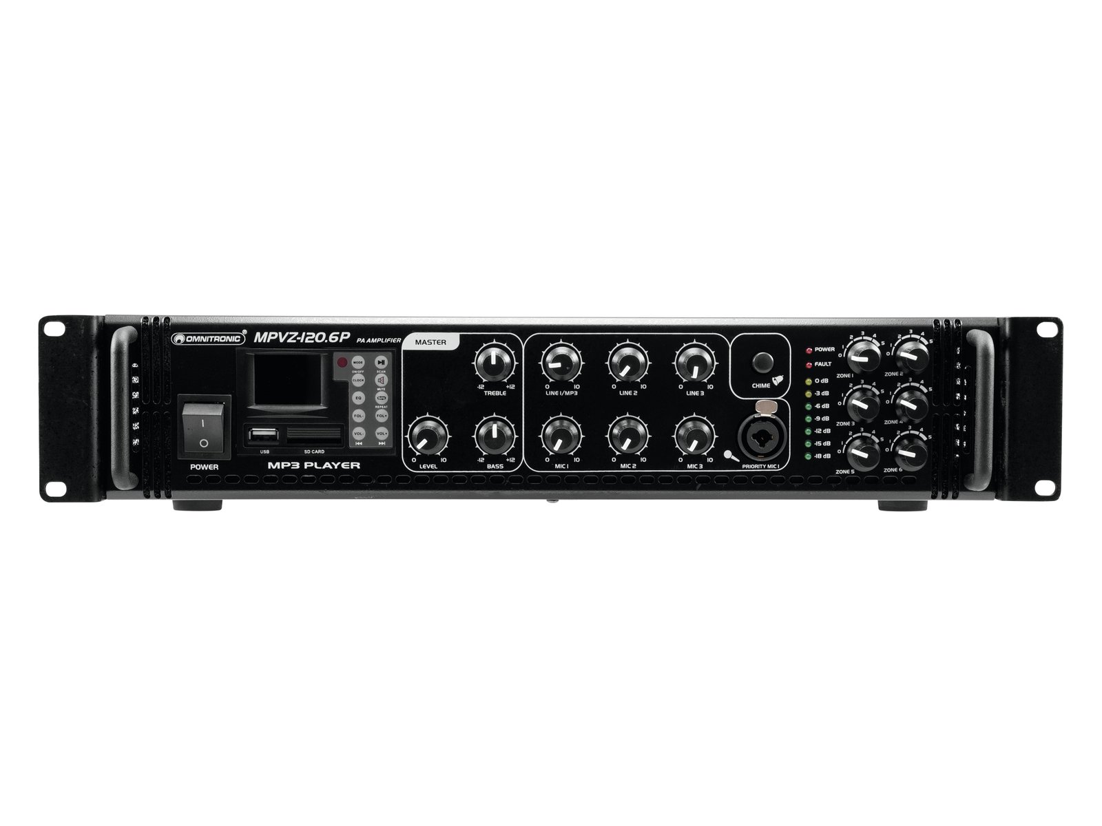 Enormous reliability with a maximum of flexibility The Omnitronic MPVZ-120.6P ELA mixing amplifier is your reliable partner for ELA sound reinforcement systems. Thanks to its 19" format, it is ideal for both mobile and permanent installations. Outputs for ELA loudspeakers with 70 V and 100 V audio transformers or 4-16- Ohm loudspeakers leave nothing to be desired. In addition, you can also connect a device with line level (e.g. mixing console) to the line output. You are always flexible with 6 mixable inputs. Connect up to 3 microphones and 3 line level devices. Control your ELA speakers conveniently via the 6 zone outputs of the MPVZ-120.6P. They are separately adjustable on the front panel with a 5-stage volume control. For you, this means the greatest possible adaptability when implementing your sound reinforcement concept.The MPZ-120.6P also offers you an MP3 player with infrared remote control and blue backlit LCD display. It has both an SD card slot and a USB port. So you can spontaneously and flexibly play music titles from a storage medium of your choice.Make yourself heard! The microphone input 3 on the front panel has an adjustable priority switch. It allows you to make important announcements with automatic, continuously adjustable level reduction of all signals. Use the gong to draw additional attention to your announcement. ProtectionA fan protects the interior of your MPVZ-120.6P from overheating. In addition to a switch-on delay, it has protection circuits against overvoltage and short-circuits. In these cases, your speakers are electrically isolated from the amplifier. This protects both the MPVZ-120.6P and your speakers from damage.