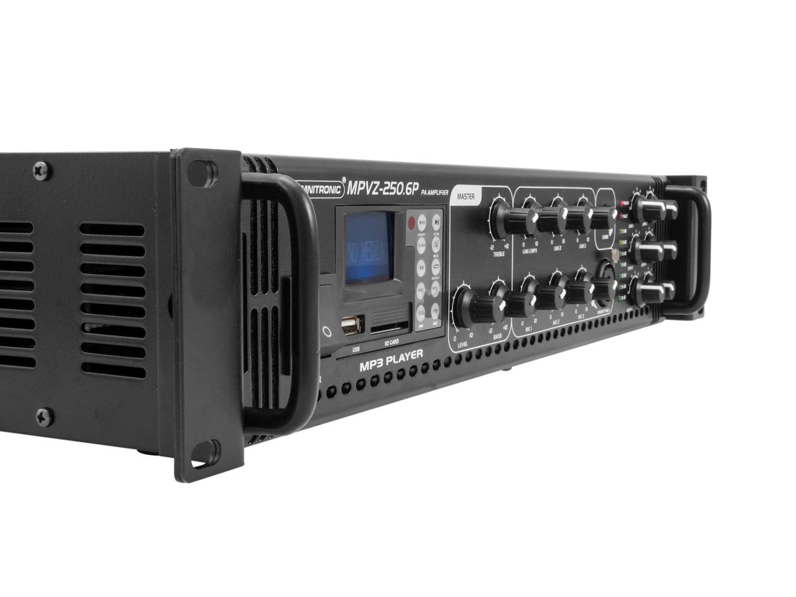 Enormous reliability with a maximum of flexibility The Omnitronic MPVZ-250.6P ELA mixing amplifier is your reliable partner for ELA sound reinforcement systems. Thanks to its 19" format, it is ideal for both mobile and permanent installations. Outputs for ELA loudspeakers with 70 V and 100 V audio transformers or 4-16- Ohm loudspeakers leave nothing to be desired. In addition, you can also connect a device with line level (e.g. mixing console) to the line output. You are always flexible with 6 mixable inputs. Connect up to 3 microphones and 3 line level devices. Control your ELA speakers conveniently via the 6 zone outputs of the MPVZ-250.6P. They are separately adjustable on the front panel with a 5-stage volume control. For you, this means the greatest possible adaptability when implementing your sound reinforcement concept.The MPZ-250.6P also offers you an MP3 player with infrared remote control and blue backlit LCD display. It has both an SD card slot and a USB port. So you can spontaneously and flexibly play music titles from a storage medium of your choice.Make yourself heard! The microphone input 3 on the front panel has an adjustable priority switch. It allows you to make important announcements with automatic, continuously adjustable level reduction of all signals. Use the gong to draw additional attention to your announcement. ProtectionA fan protects the interior of your MPVZ-250.6P from overheating. In addition to a switch-on delay, it has protection circuits against overvoltage and short-circuits. In these cases, your speakers are electrically isolated from the amplifier. This protects both the MPVZ-250.6P and your speakers from damage.