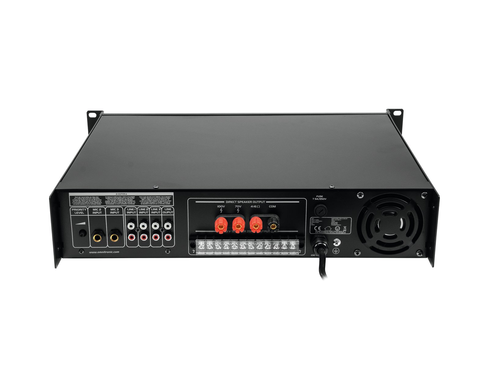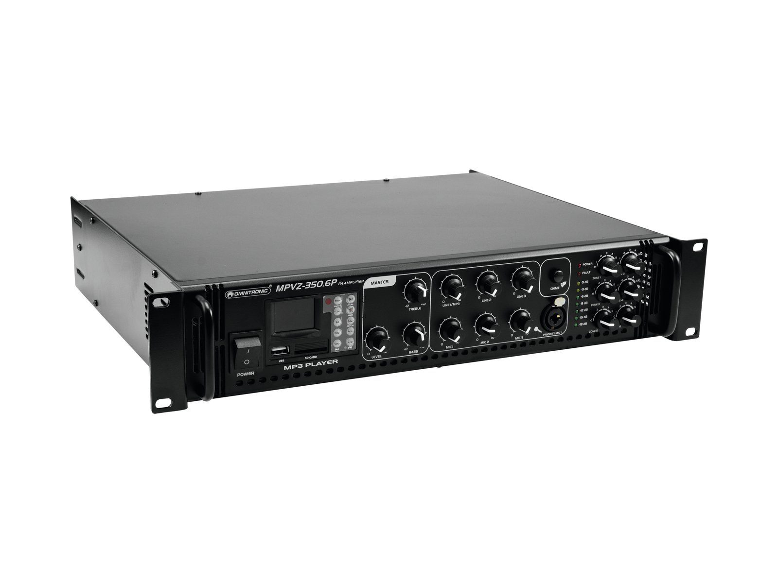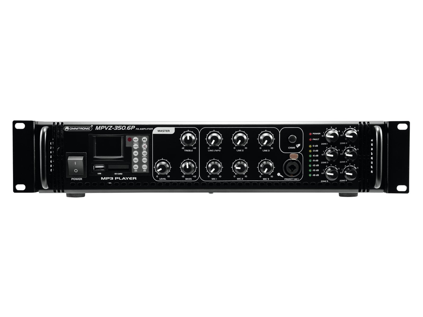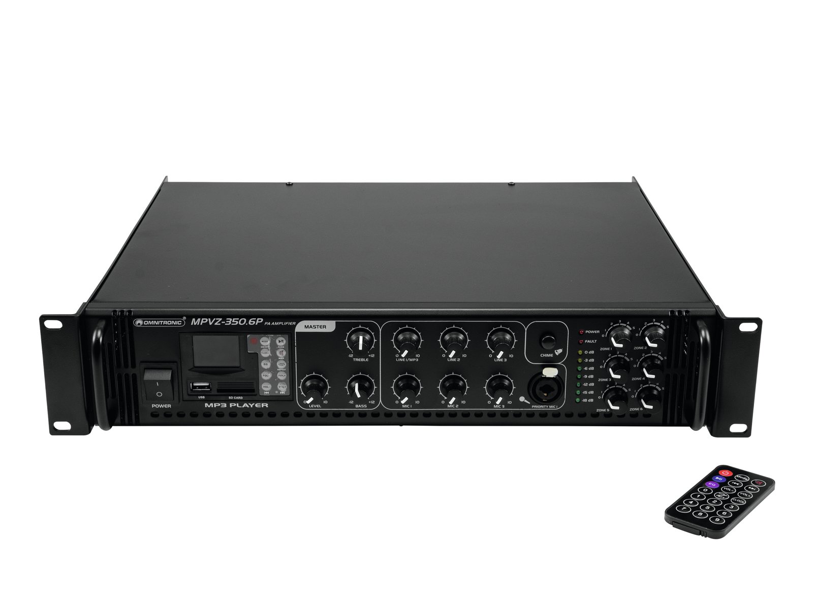 Enormous reliability with a maximum of flexibility The Omnitronic MPVZ-350.6P ELA mixing amplifier is your reliable partner for ELA sound reinforcement systems. Thanks to its 19" format, it is ideal for both mobile and permanent installations. Outputs for ELA loudspeakers with 70 V and 100 V audio transformers or 4-16- Ohm loudspeakers leave nothing to be desired. In addition, you can also connect a device with line level (e.g. mixing console) to the line output. You are always flexible with 6 mixable inputs. Connect up to 3 microphones and 3 line level devices. Control your ELA speakers conveniently via the 6 zone outputs of the MPVZ-350.6P. They are separately adjustable on the front panel with a 5-stage volume control. For you, this means the greatest possible adaptability when implementing your sound reinforcement concept.The MPZ-350.6P also offers you an MP3 player with infrared remote control and blue backlit LCD display. It has both an SD card slot and a USB port. So you can spontaneously and flexibly play music titles from a storage medium of your choice.Make yourself heard! The microphone input 3 on the front panel has an adjustable priority switch. It allows you to make important announcements with automatic, continuously adjustable level reduction of all signals. Use the gong to draw additional attention to your announcement. ProtectionA fan protects the interior of your MPVZ-350.6P from overheating. In addition to a switch-on delay, it has protection circuits against overvoltage and short-circuits. In these cases, your speakers are electrically isolated from the amplifier. This protects both the MPVZ-350.6P and your speakers from damage.
