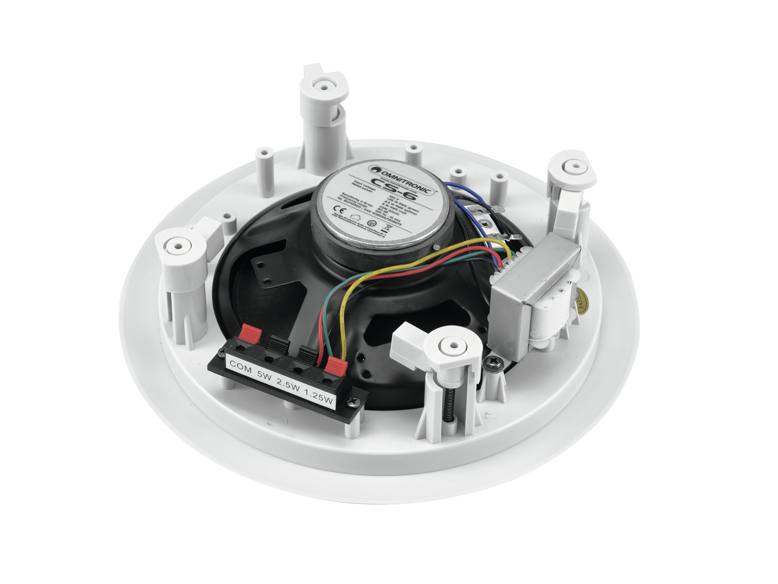 Home INDOOR PUBLIC ADDRESS SPEAKERS OMNITRONIC CS-6 Ceiling Speaker white OMNITRONIC CS-6 Ceiling Speaker white SKU: 80710220 37,02 € Desconto de %. IVA incluído. Comprar Contactar Adicionar à wishlist 6.5" full-range flush-mount speaker, 100 V, 5 W RMSFor speech and background music in indoor PA systemsScratchproof and shockproofFor further information about this product, please refer to the Data Sheet under "Downloads"Package contents1 x device, 1 x user manualPower:Program: 10WRated: 5W RMSFrequency range:100 - 10000 HzSensitivity:90 dB (1W/1m)Impedance:Public address systems 100VPower tapping:1,25W; 2,5W; 5W RMS via Spring terminal switchableSpeaker:1 x woofer (6.5") approx. 17 cmType of speaker:Flush-mount speakerMaterial:ABS Acrylonitrile butadiene styreneColor:White, scratchproof and shockproofMounting dimensions:Ø 19,5 cmDimensions:Depth: 7 cmDiameter: Ø 23 cmWeight:890 g Marca Omnitronic Tags OMNITRONICCS-6CeilingSpeakerwhitePalestrante Partilhar